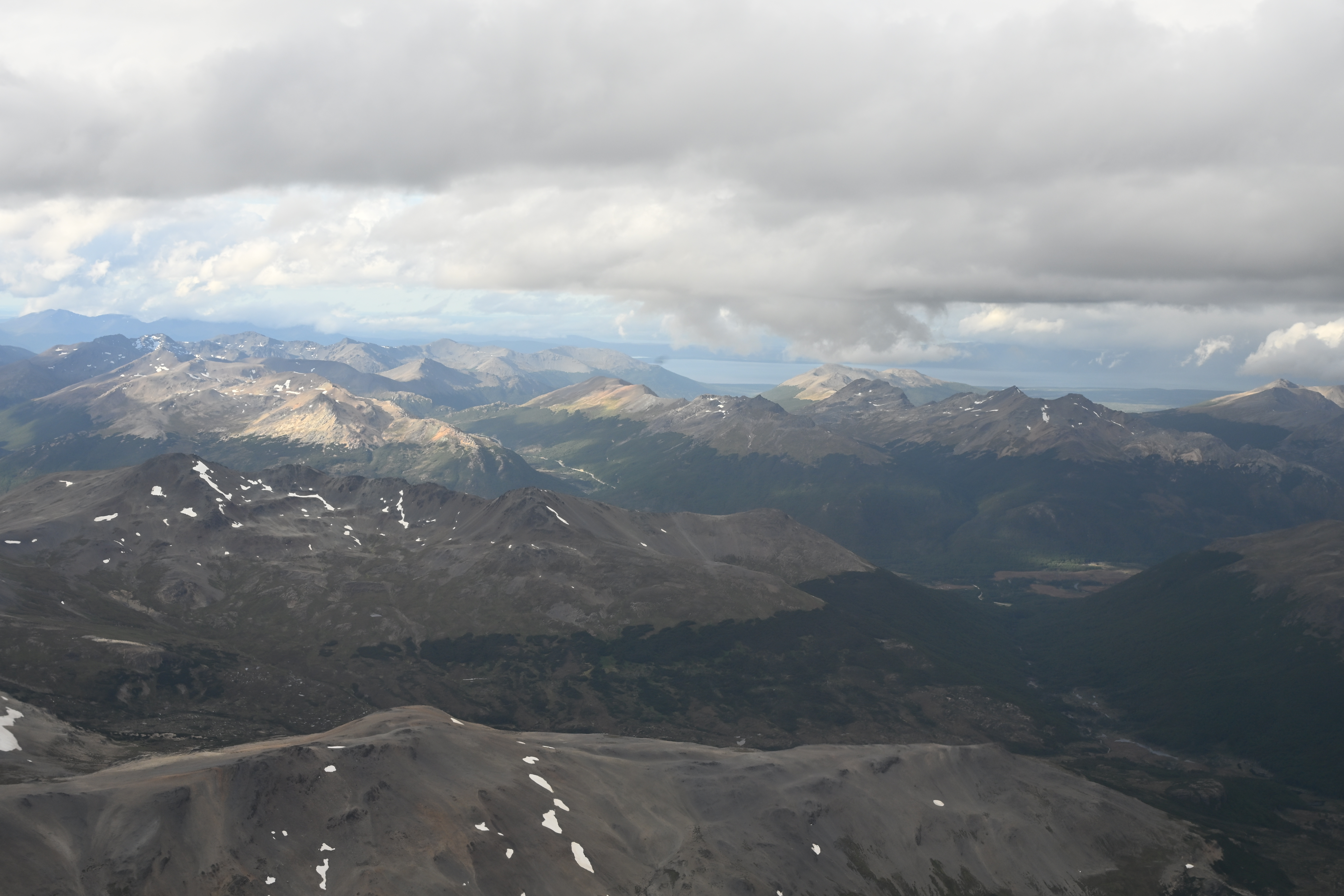 Nach Auschecken und nochmaligem Geldwechsel – diesmal bekamen wir viele kleine Scheine (ca. ein halbes Kilo) – fuhren wir zum Flughafen. Die Wartezeit überbrückten wir mit einem kleinen Mittagessen. Mit ein wenig Verspätung flogen wir ab, kamen aber pünktlich in Ushuaia an. An der Grenze zwischen Chile und Argentinien sahen wir im Gegenlicht auch den östlichen Anfang der Magellanstraße, die wir in drei Tagen auf der Reise nach Punta Arenas überqueren werden. Der Transfer zu unserem „Hotel Los Naranjos“ erfolgte klaglos.