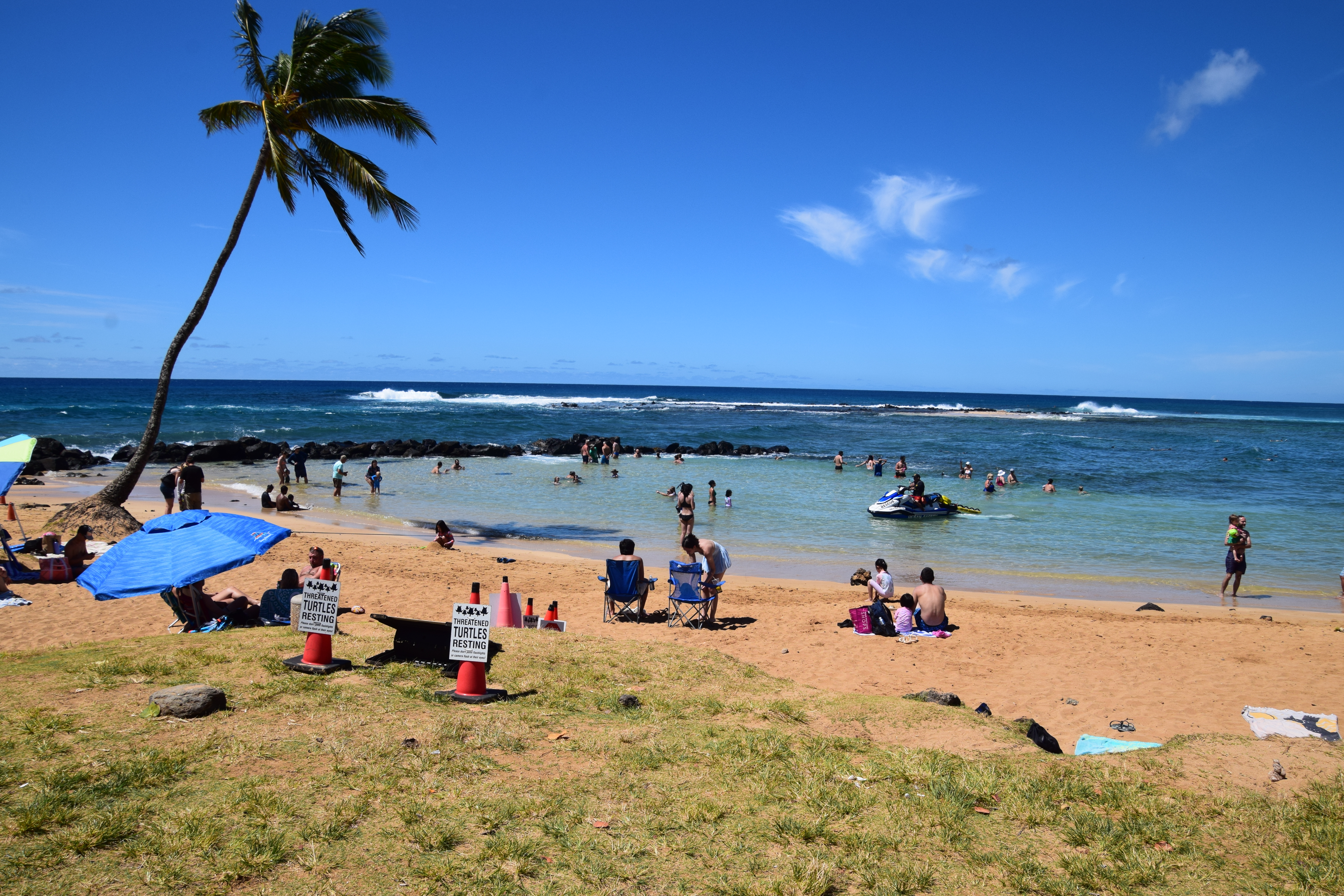 Heute wechselten wir von der East an die South Coast. Unterwegs stoppten wir zunächst am Po’ipù Beach Park. Der Beach Park ist bei Familien mit kleinen Kindern sehr beliebt, da das Meer innerhalb eines (künstlichen) Riffs sehr ruhig ist. Er waren auch schon viele Besucher da, die bei doch etwas rauer See schwammen und schnorchelten. Ansage des Lifeguard: „Today is not a good day to learn to swim.“ Ein paar Schritte weiter gibt es eine kleine Bucht mit schönen Wellen zum Bodysurfen. Wir haben eine Zeitlang den Meeresschildkröten in den Wellen, vermutlich bei der Nahrungssuche, zugeschaut.