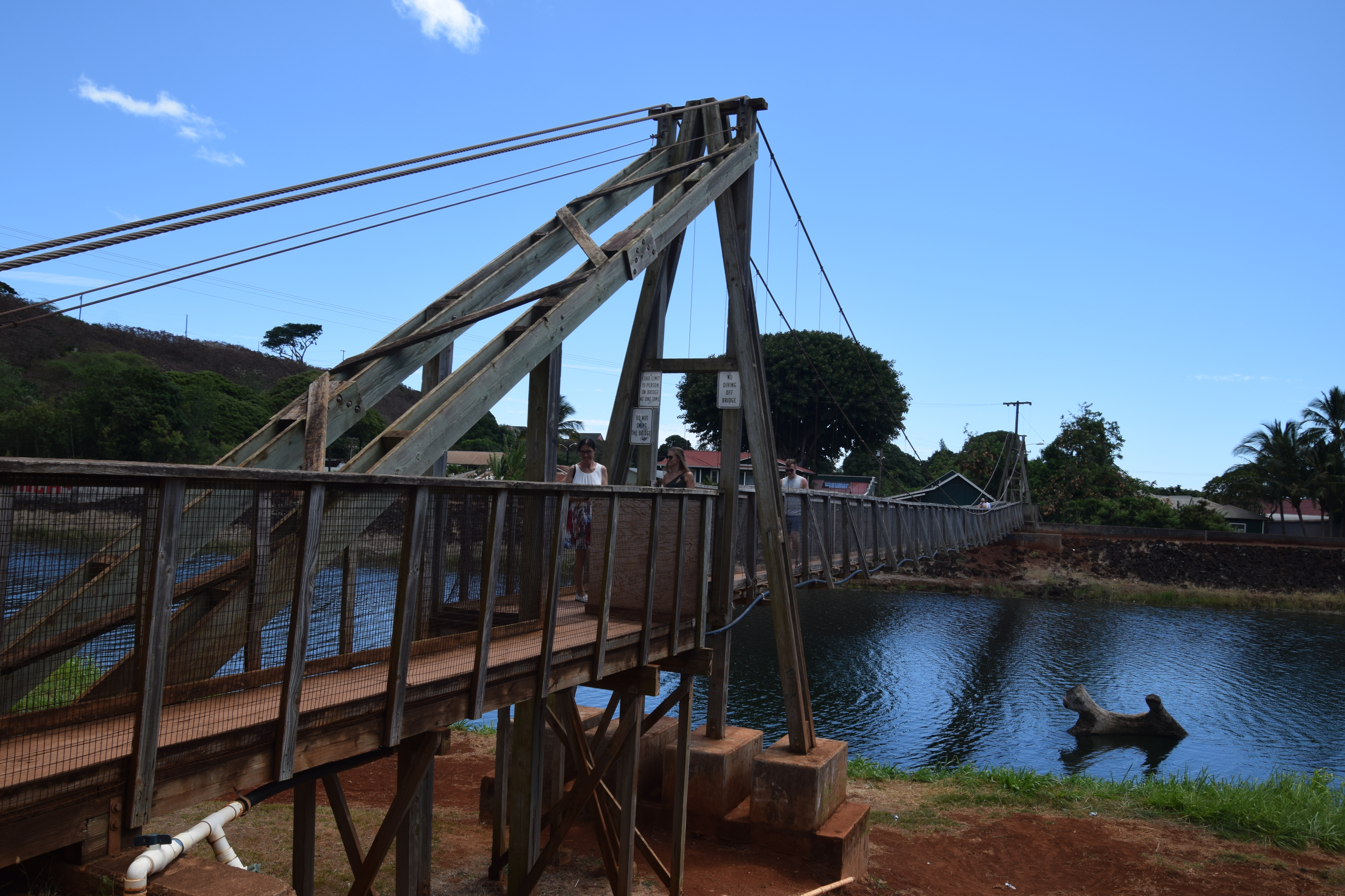 Am weiteren Weg lag Hanapepe. Am bekanntesten ist die Taro Ko Farm, die für ihre verschiedenen Chips berühmt ist. Leider wollte der Besitzer nicht öffnen. Helga hat ihn tatsächlich angetroffen, doch hat er sie nur sehr unhöflich auf das geschlossene Geschäft aufmerksam gemacht. Die historische Swinging Bridge konnten wir jedoch besichtigen und auch überqueren. Beim Shop an der Brücke, konnte Helga einem „Lava Flow“-Eis (Pina Colada und Strawberrys Eis) nicht widerstehen.