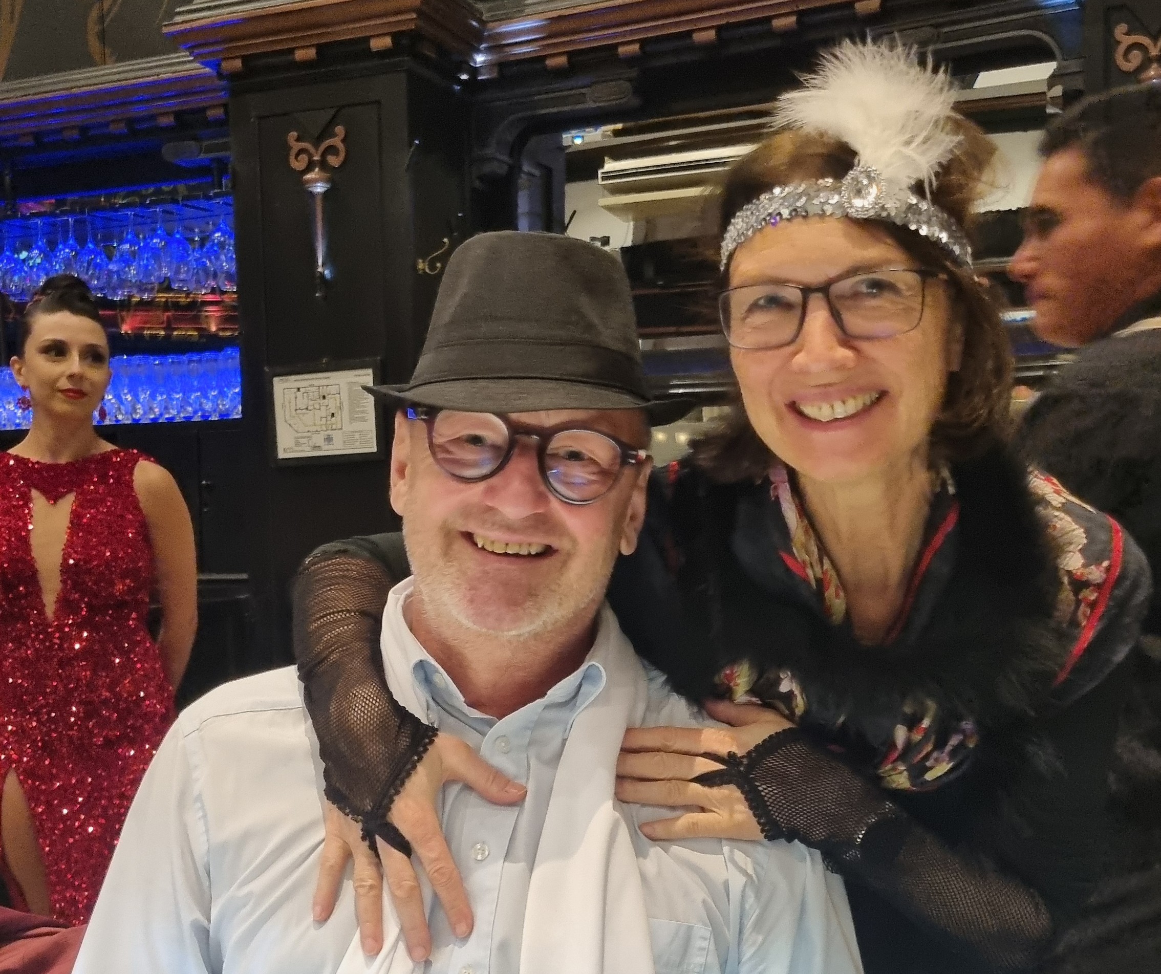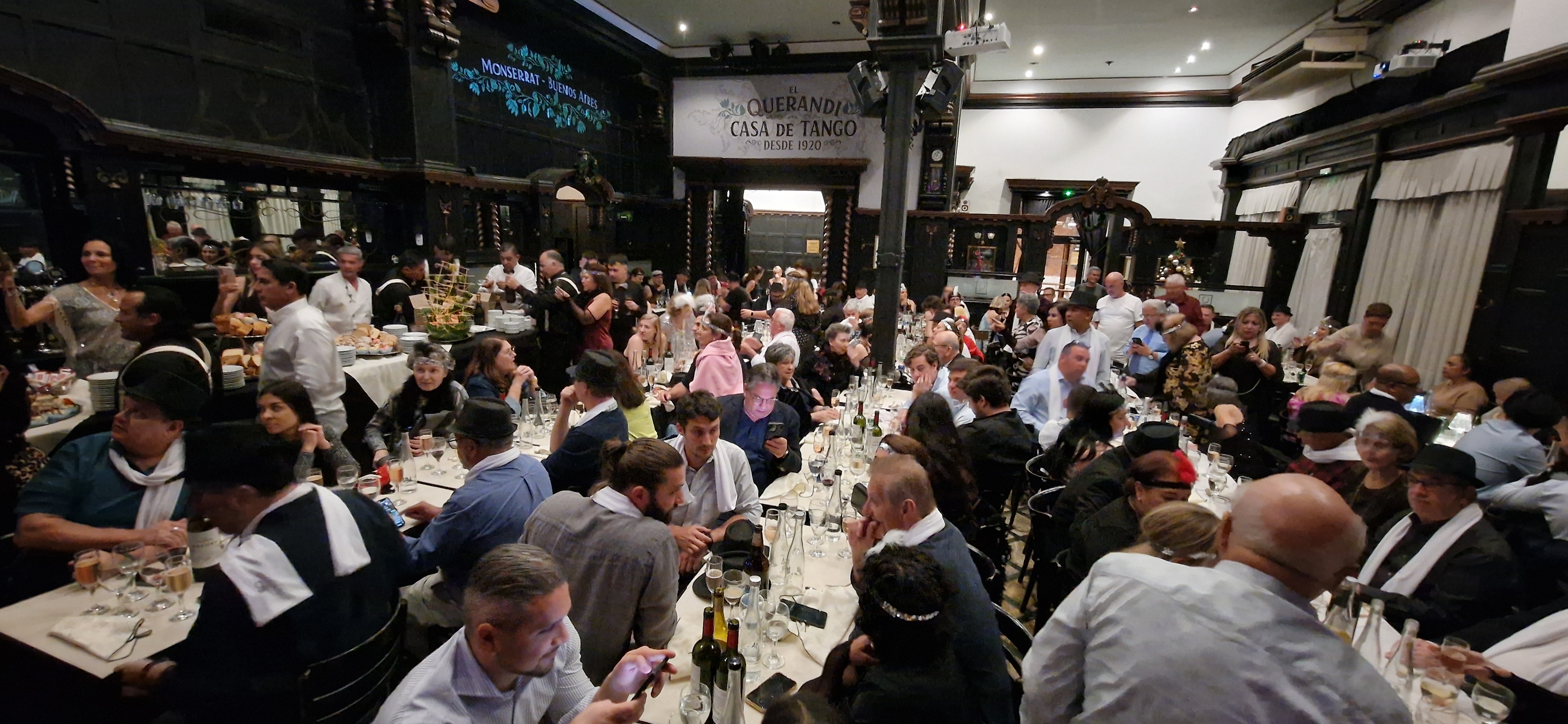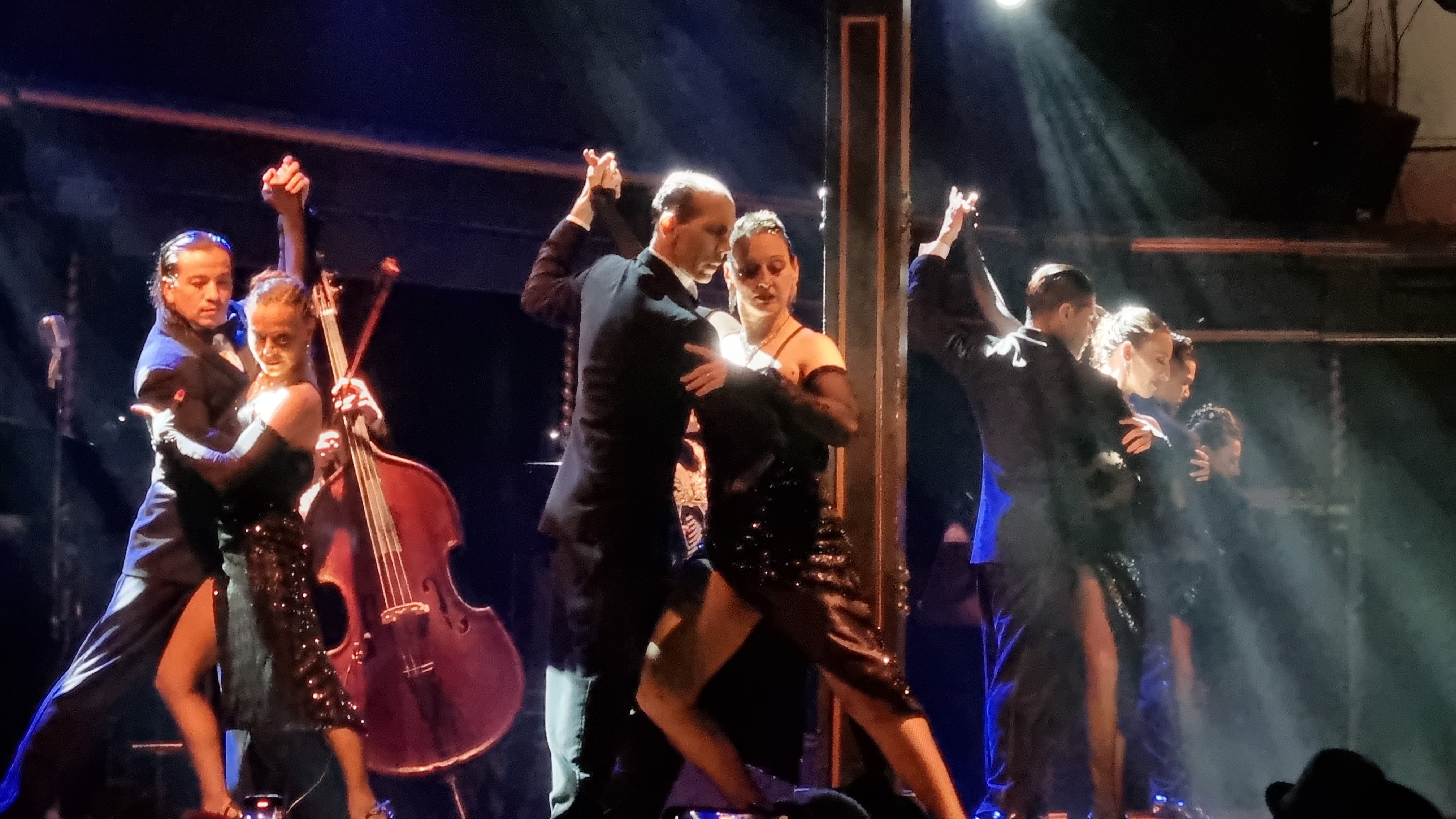 Die Abholung war inklusive. Doch war die Zeitangabe „ab 19 Uhr“ wörtlich zu nehmen. Schließlich wurden wir um 19:30 Uhr abgeholt und zur Show im „El Querandi“ gebracht. Die uns zugewiesenen Sitzplätze waren zwischen jeweils Mutter und Tochter aus Argentinien bzw. New York. Auch kleine Accessoires nach dem Motto der Show „1920“ wurde uns übergeben. Es gab zunächst reichlich zu Essen und zu Trinken. Danach dauerte die unterhaltsame Show mit Livemusikern, Sängern und Tangotänzern, jeweils Frauen und Männer, rund 90 Minuten. Selbstverständlich wurde auch der Bartresen als Tanzfläche genutzt. Tangoshows gibt es in dieser Location schon seit 1920.