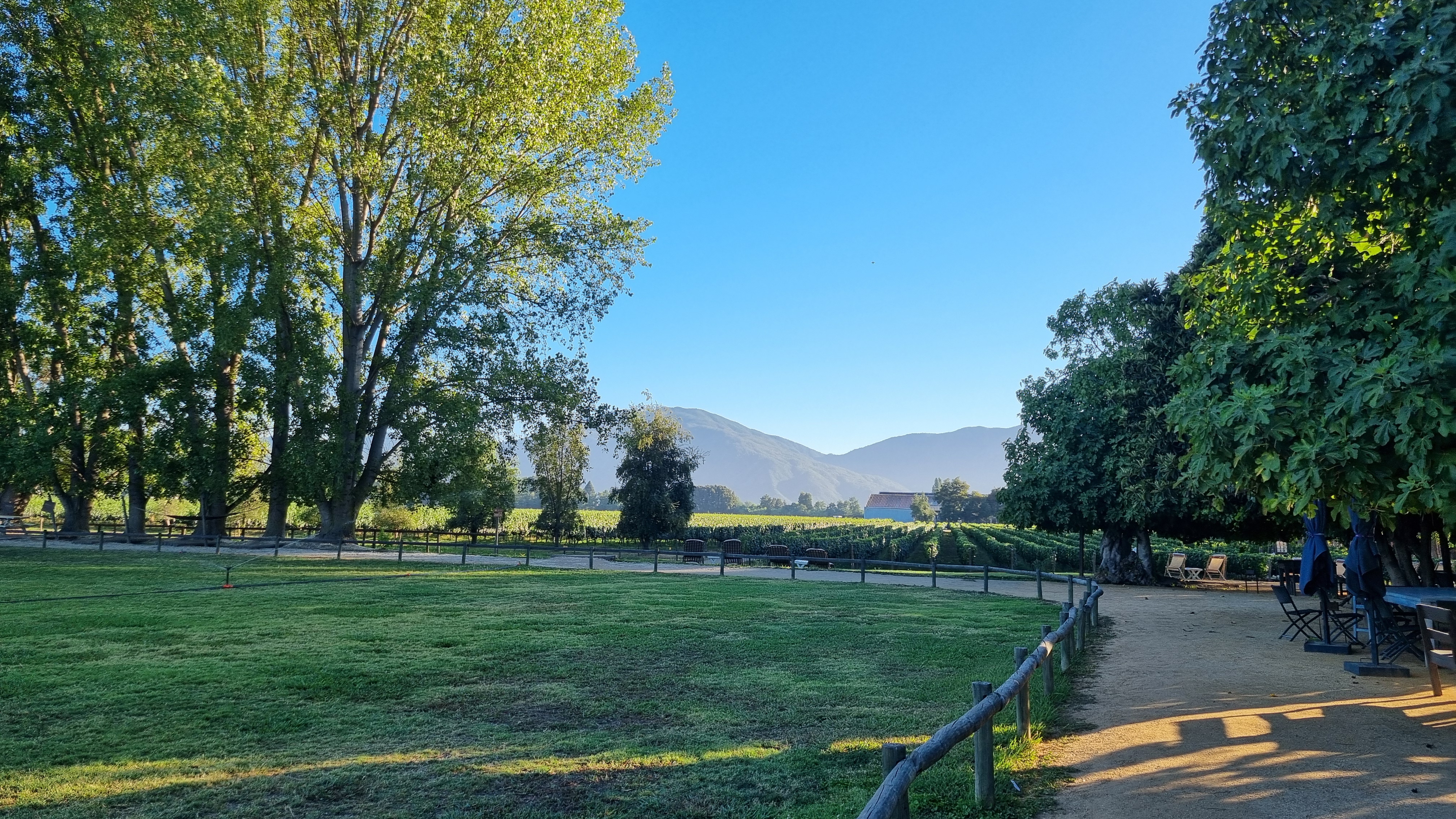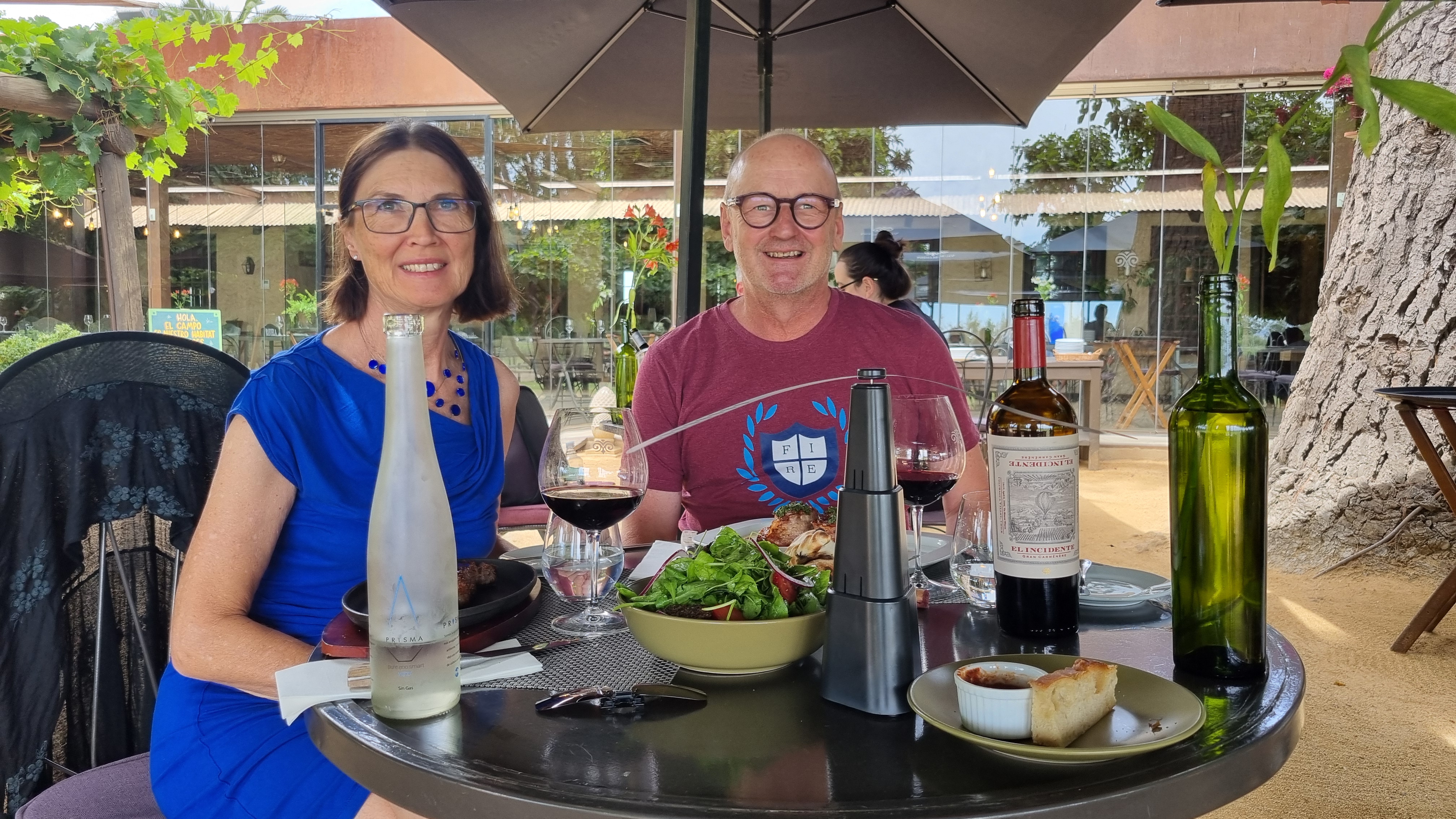 Um 13:30 Uhr hatten wir im Rayuela Wine & Grill, auch Teil des Weinguts Viu Manent, einen Tisch reserviert. Empanadas mit Ei, Champignon, Rindfleisch und Zwiebel (die besten bislang), ein Rib-Eye, ein Filet und einen Salat ließen wir uns gemeinsam servieren. Begleiten ließen wir uns vom El Incidente (exakt 85% Caménère und 15% Malbec), der sich gestern als unser Favorit herauskristallisiert hat. Wir sind sonst sehr bescheiden.