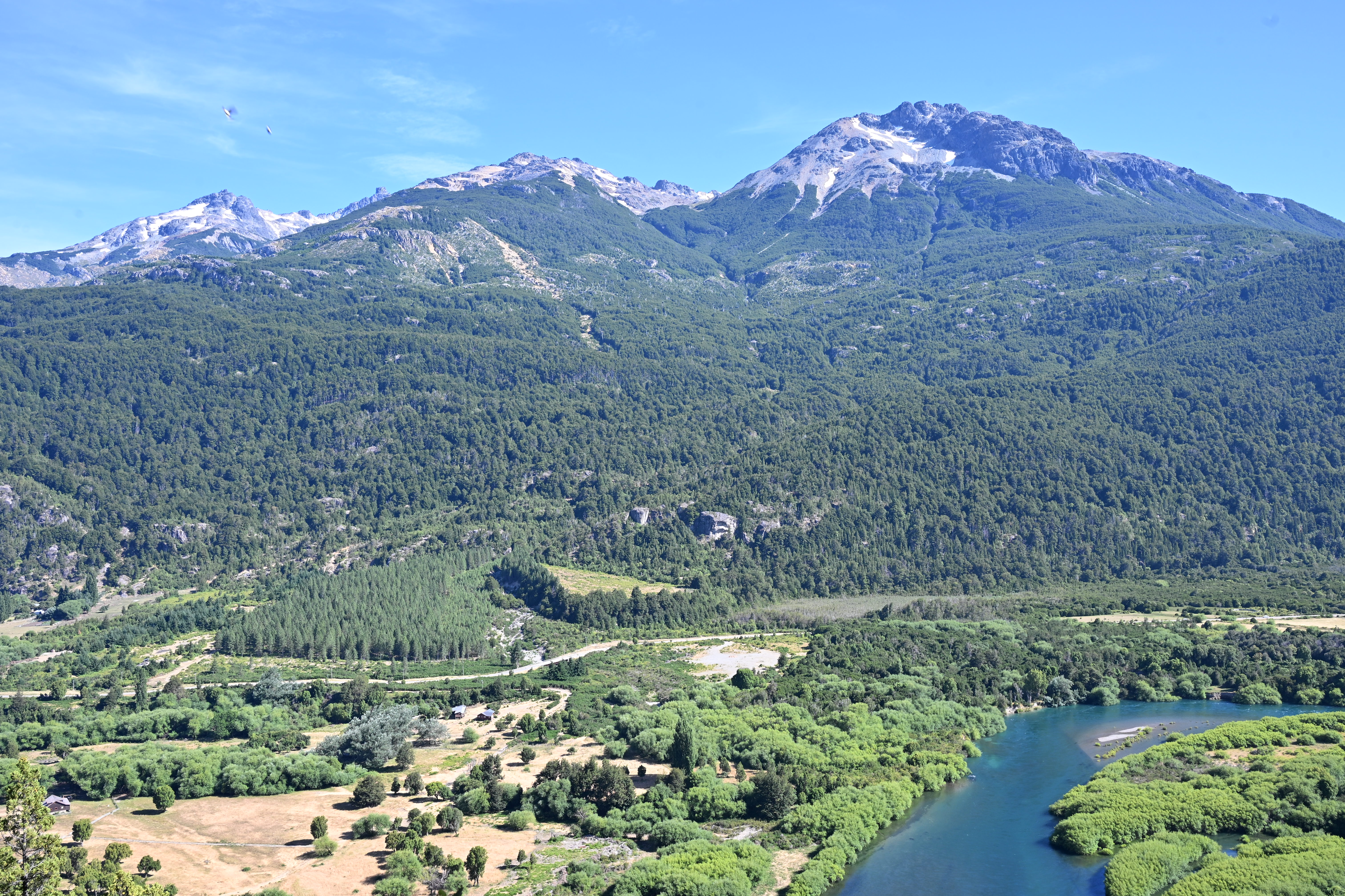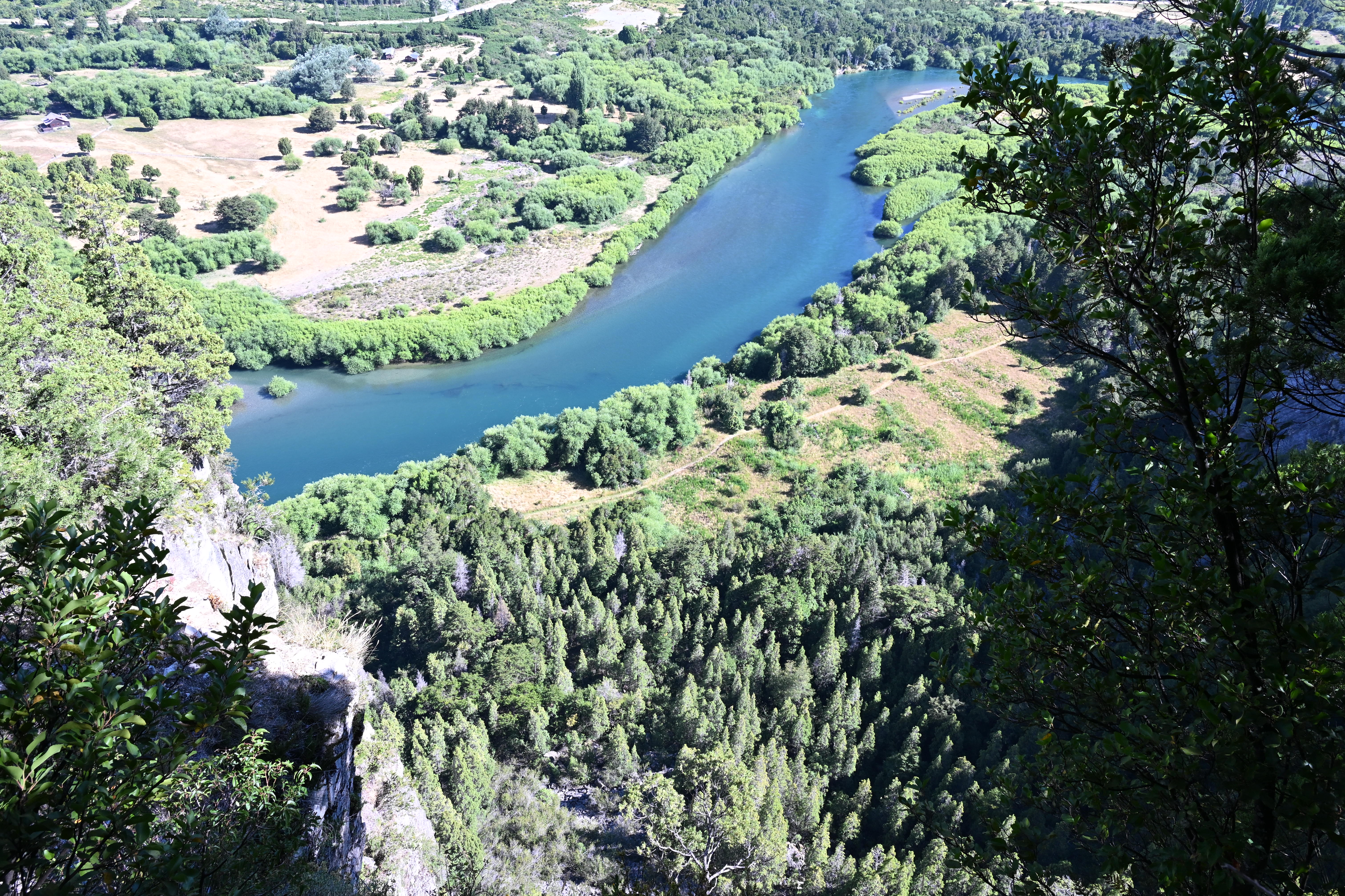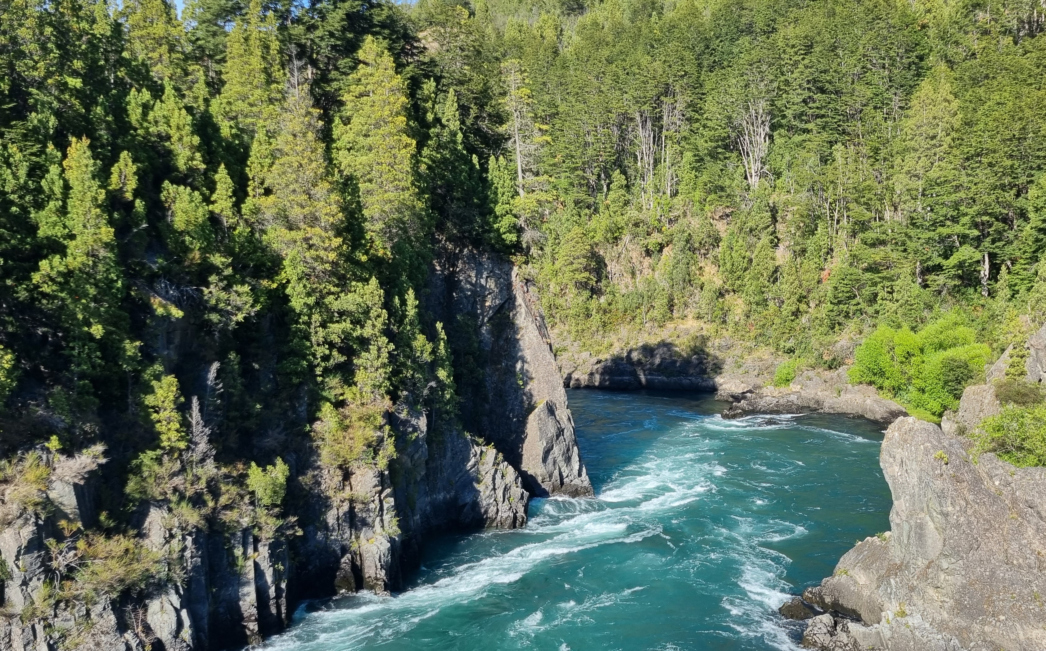 Heute hatten wir nur 75 km und nach Google Maps rund 1:45 Stunden plus die Aus- und Einreise von Chile/ nach Argentinien zu absolvieren. Nach dem Frühstück und Einpacken ging es daher zum Reserva Nacional Futaleufú, genau zum Sector Rio Chico. Dabei überquerten auch den Futaleufú River, der wegen seiner Stromschnellen bei Kajakfahrern und fürs Rafting begehrt ist.