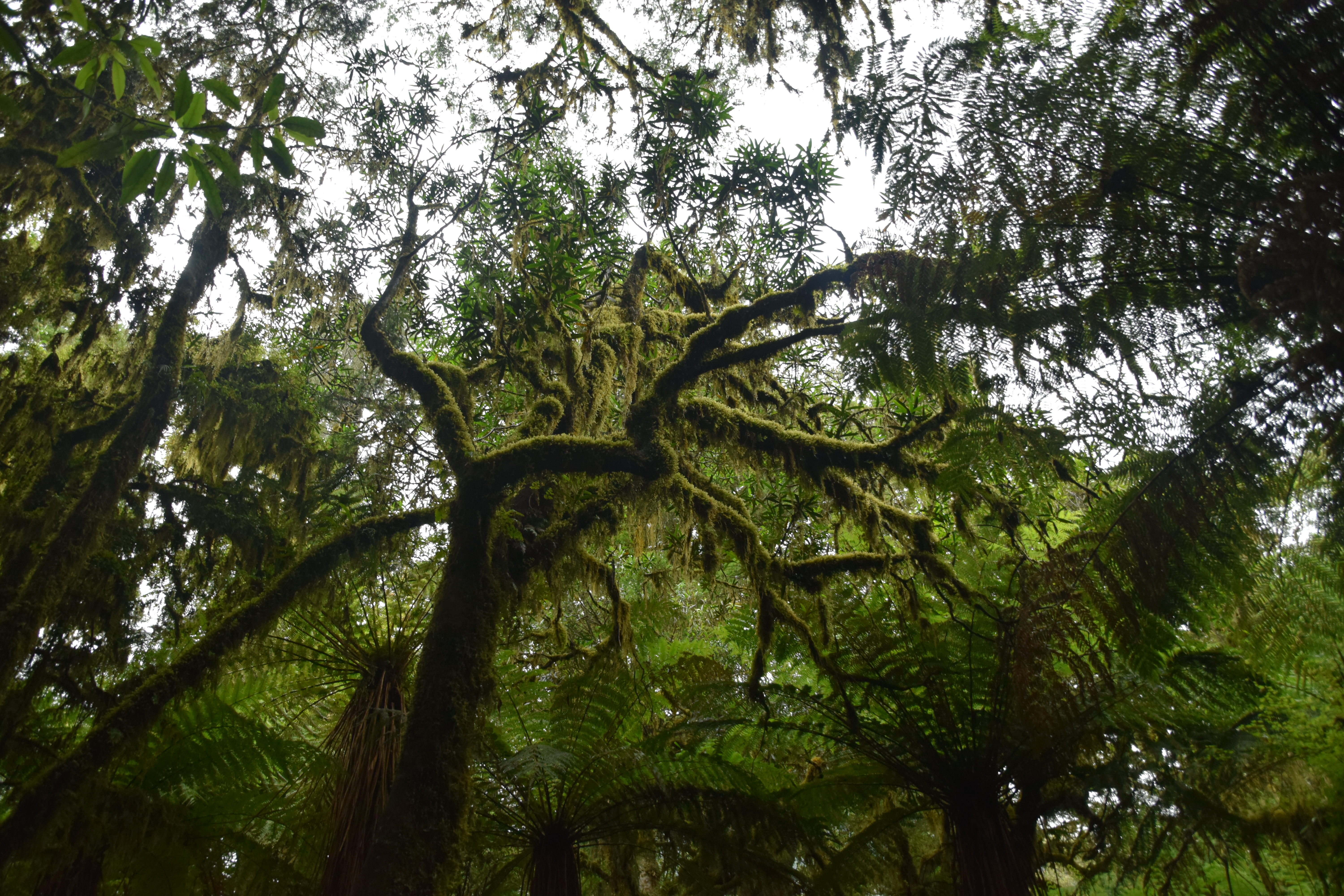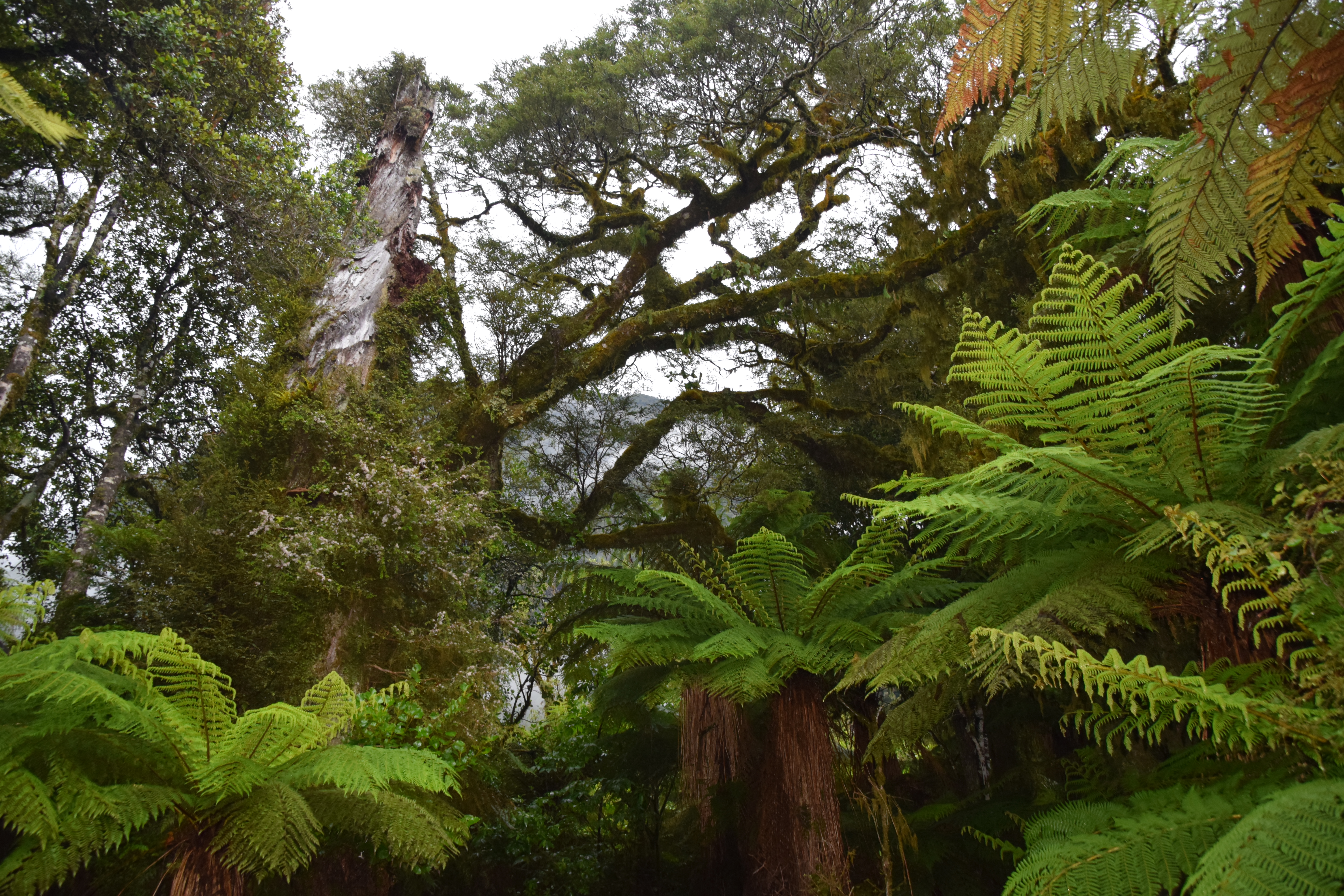 Auf der Straße über den Haast-Pass gibt es einige sehenswerte Punkte, die wir uns nicht entgehen ließen. So gibt es einige Lookouts direkt neben der Straße. Ein netter Walk war zu den Roaring Billy Falls. In den Farnwäldern gibt es immer wieder beeindruckende Bäume zu sehen (soll in dieser Gegend Rimu- und Kahikateabäume geben). Die exakte Bestimmung der Bäume ist für uns Ungeübte aber schwierig, da sie mit Moos und Flechten bewachsen sind. Die Beschreibungen auf den Wegen sind auch nicht immer hilfreich, da immer wieder neue Name präsentiert werden und die Bilder für uns nicht eindeutig sind.