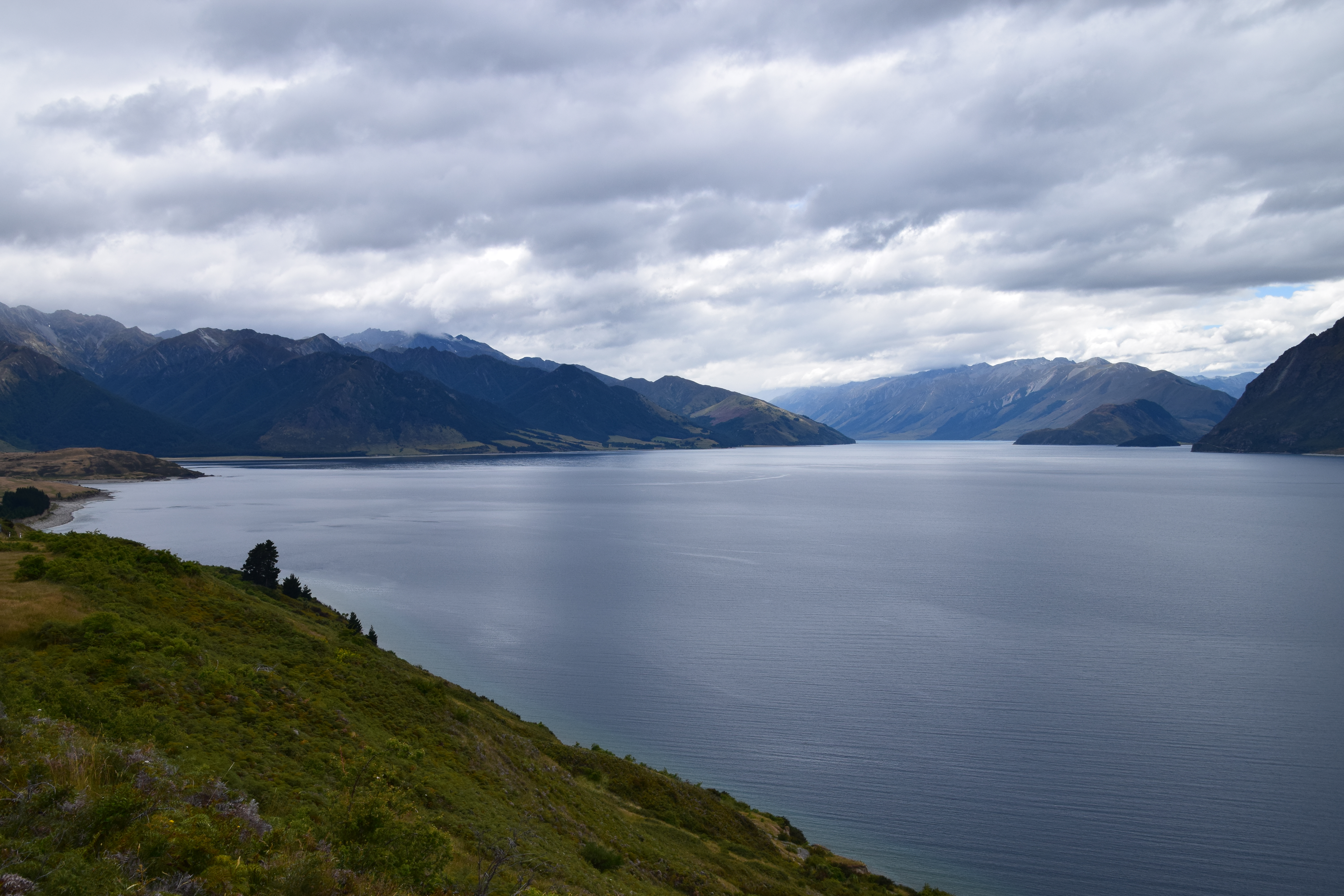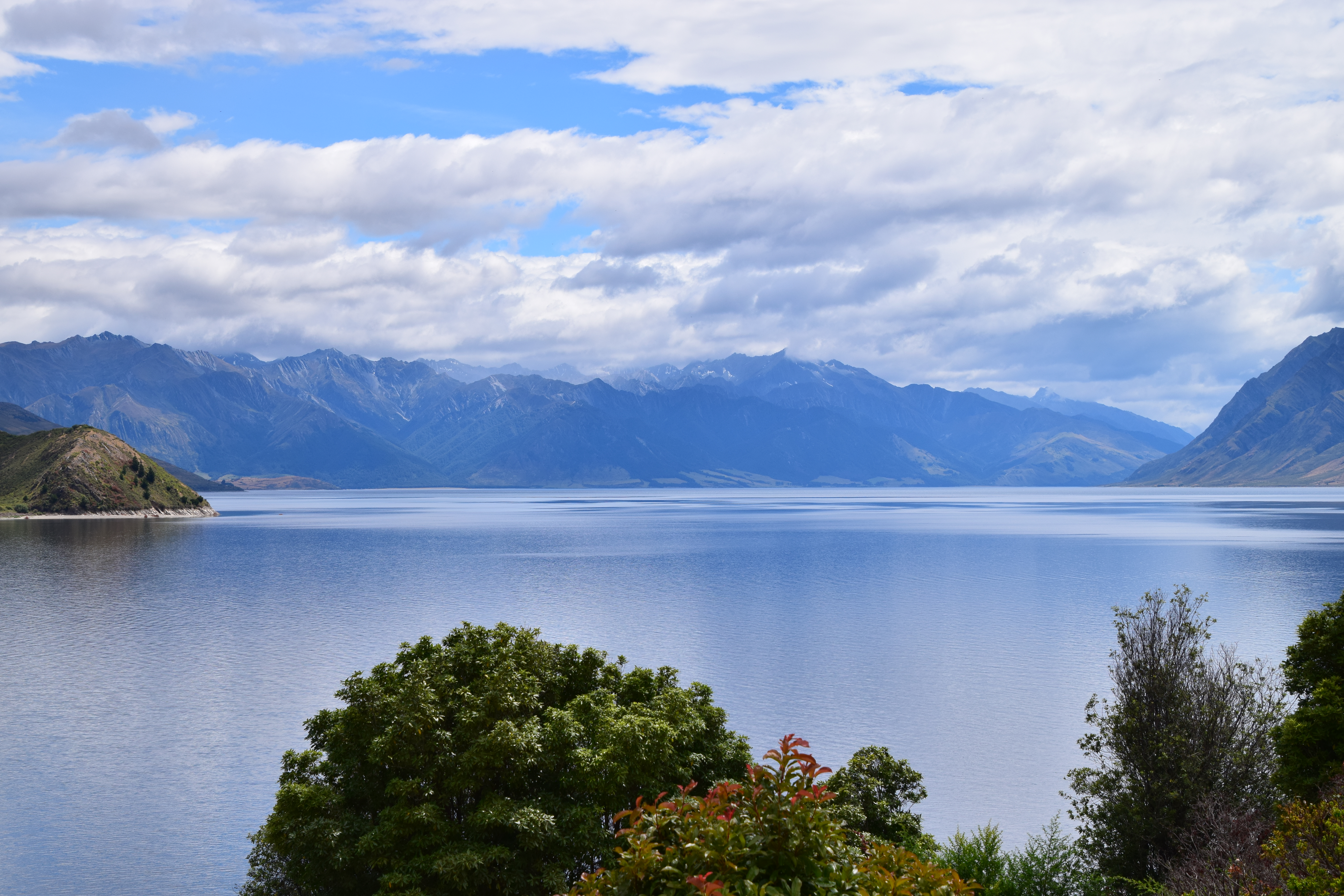 In Makaroa erfuhren wir den bereits vermuteten Cancel der Tour, da vor allem Wanderung und Jetboat bei Regen sehr nass werden kann. Wir fuhren daher gemütlich weiter bis zu unserem Quartier, machten ein paar Stopp bei den traumhaften Ausblicken auf den Lake Wanaka und Lake Hawea und auch auf die Bergwelt. In Hawae angekommen, hatten wir bereits wieder schönes Wetter und auch 22 (später 27) Grad. Es ist hier so, dass ungefähr in der Mitte des Sees die Wetterscheide ist.
