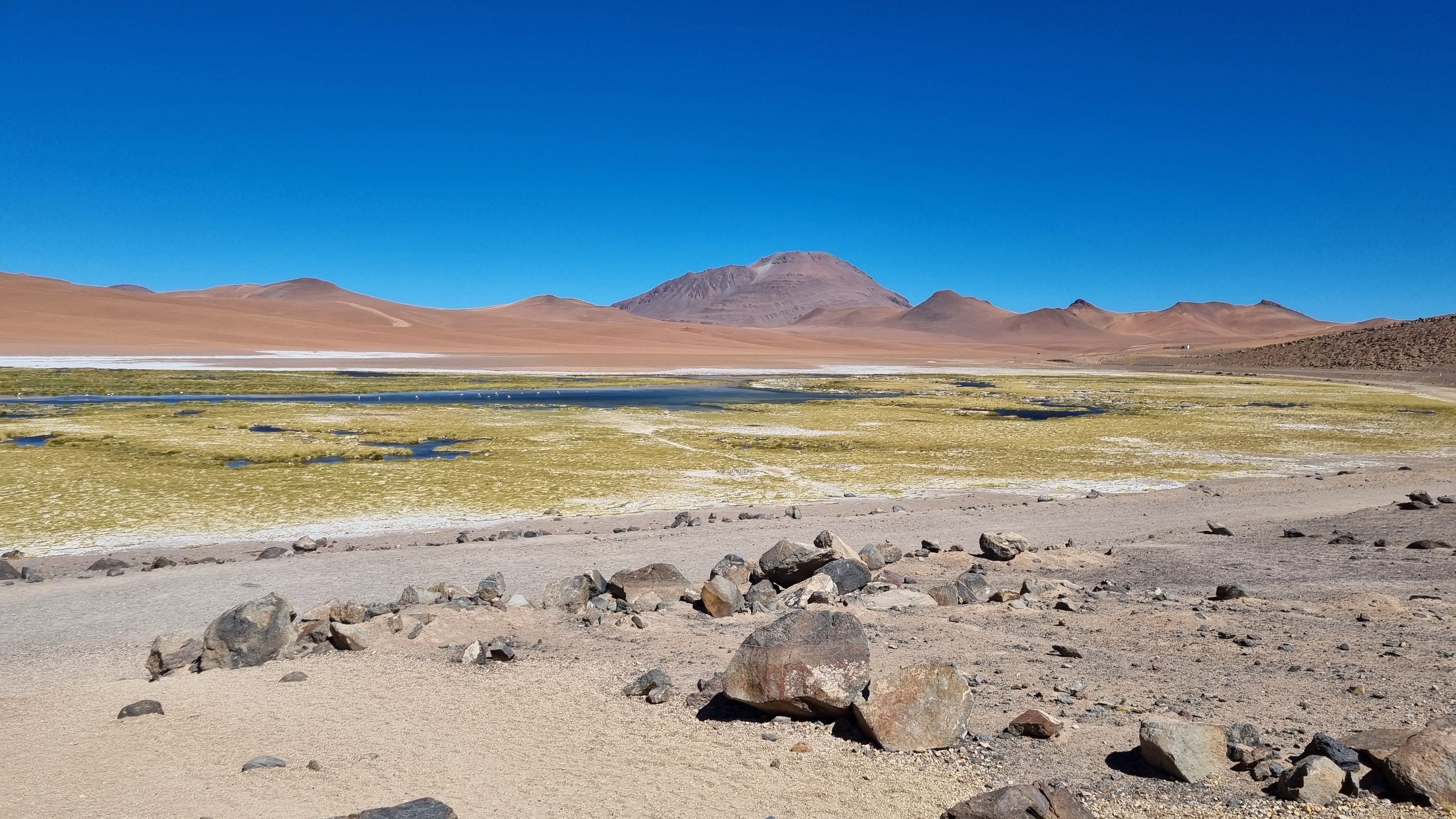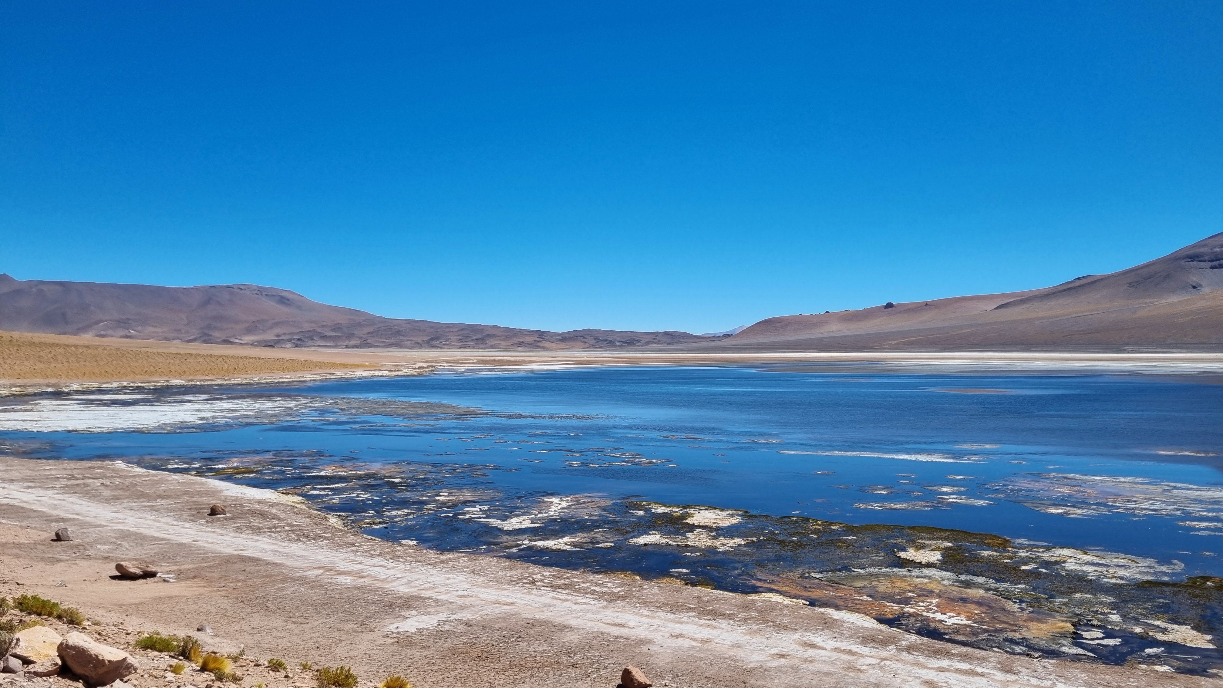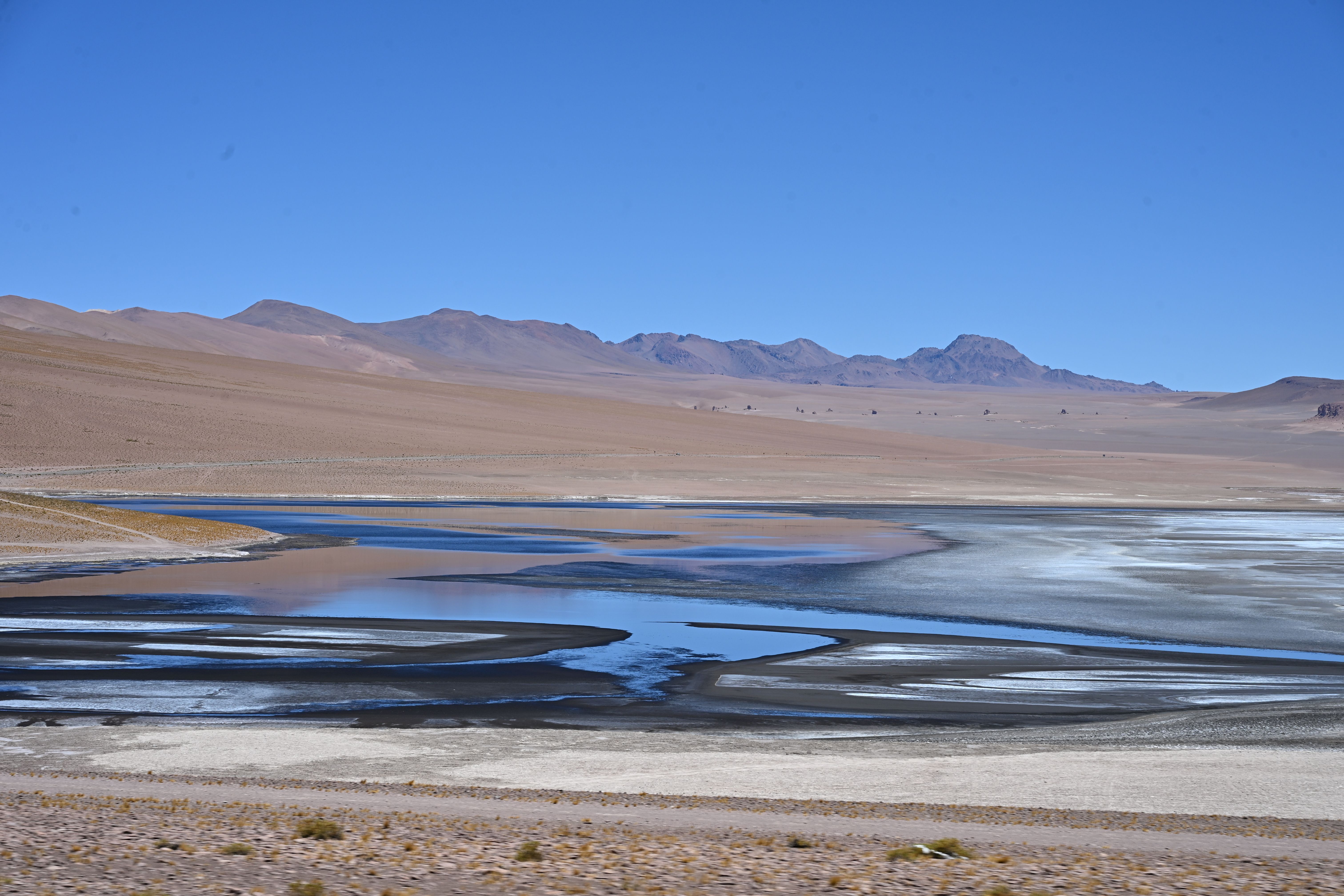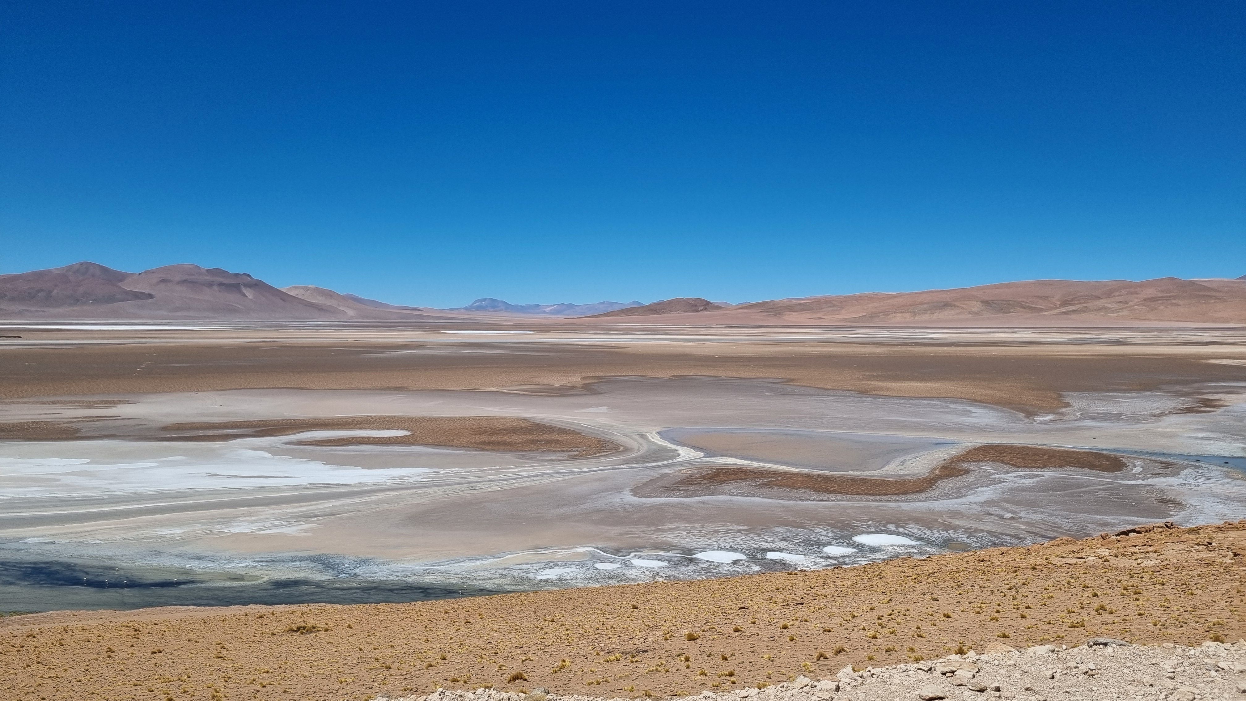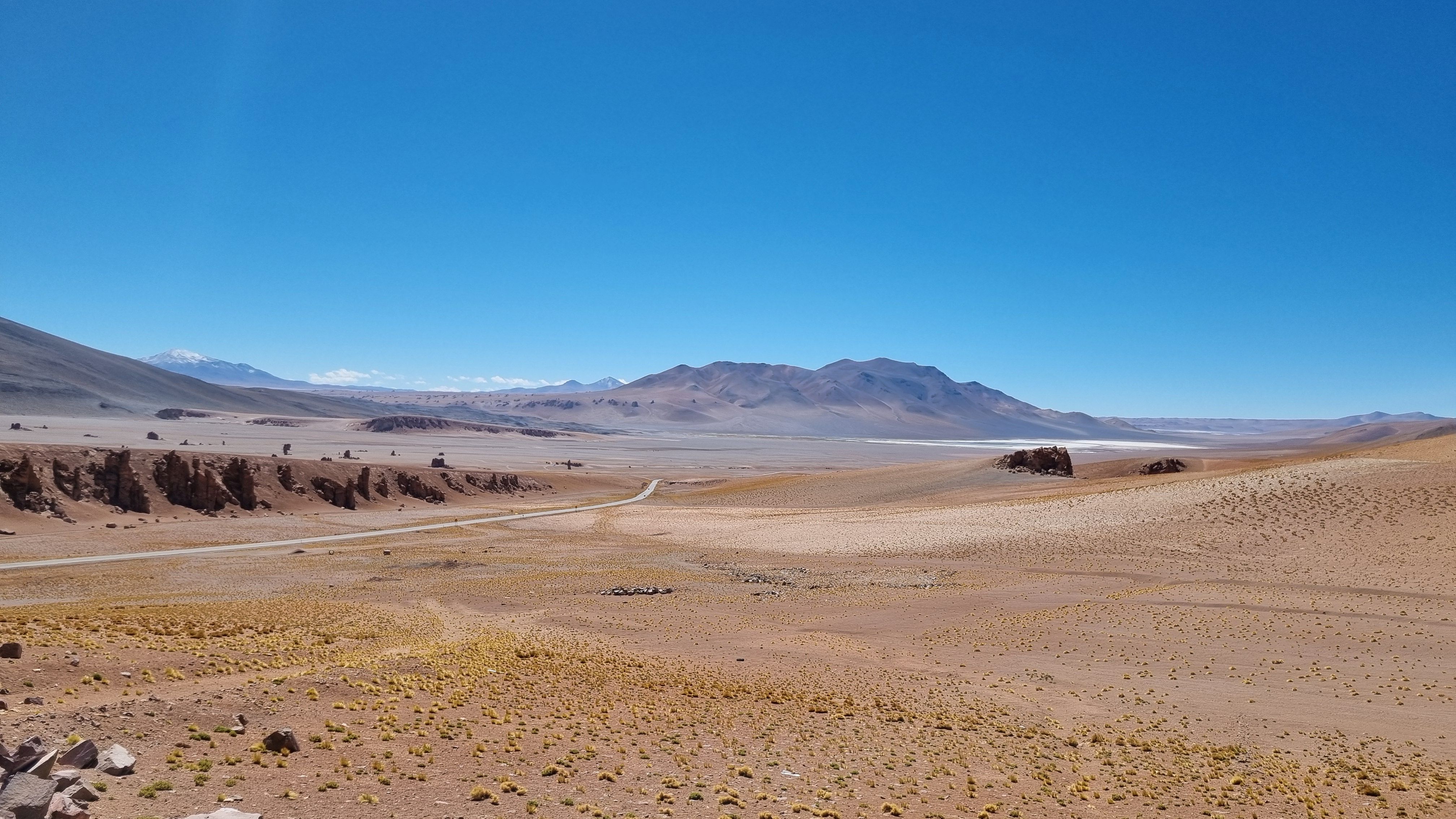 Weiter ging es, noch immer bergauf, durch eine sehr karge Landschaft bis zum ersten Aussichtspunkt „Quepiaco“. Von diesem See schlängelt sich rund 2 km ein kleiner Fluss ins Tal, begleitet von Vicuñas. Inzwischen spürten wir auch den Einfluss der Höhe auf Geist und Körper. Laut Stefans Uhr bewegten wir uns um die 4.800 m ü.M. Die Überprüfung auf Open Street Map zeigt ein Maximum von 4.831 m ü.M. Damit waren wir 26 m über dem Mont Blanc Gipfel.