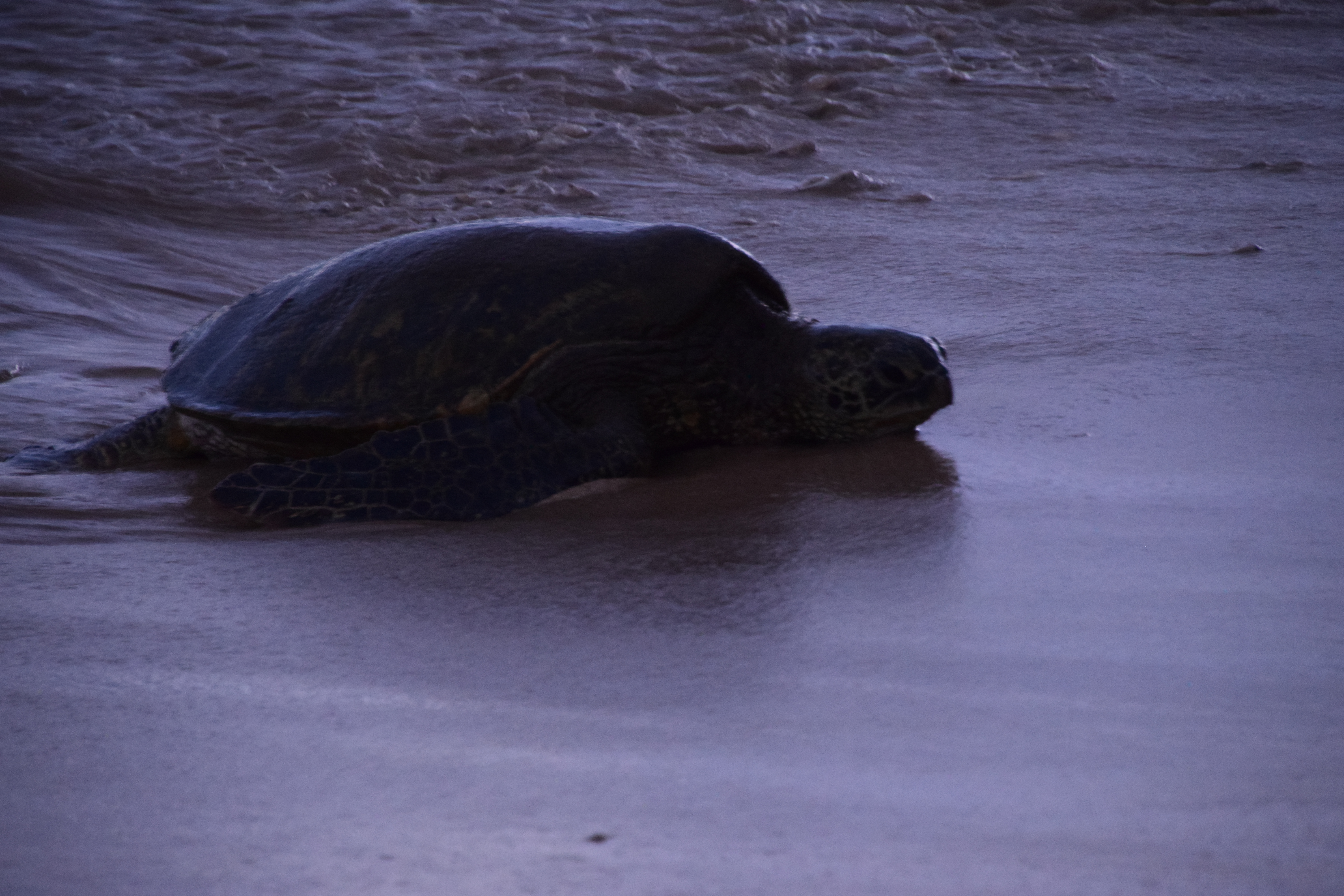 Gestern hatten wir erfahren, dass am Abend die Meeresschildkröten zum Schlafen an unseren Strand kommen. Wir verbrachten rund um den Sonnenuntergang eine gute Stunde am Strand. Das ganze Spektakel lockt eine Reihe von Besuchern an. Zu Beginn sahen wir nur immer wieder Schildkröten zum Atmen auftauchen. Aber rund 10 Minuten nach Sonnenuntergang waren dann innerhalb kürzester Zeit mindesten 15 Schildkröten am Strand.