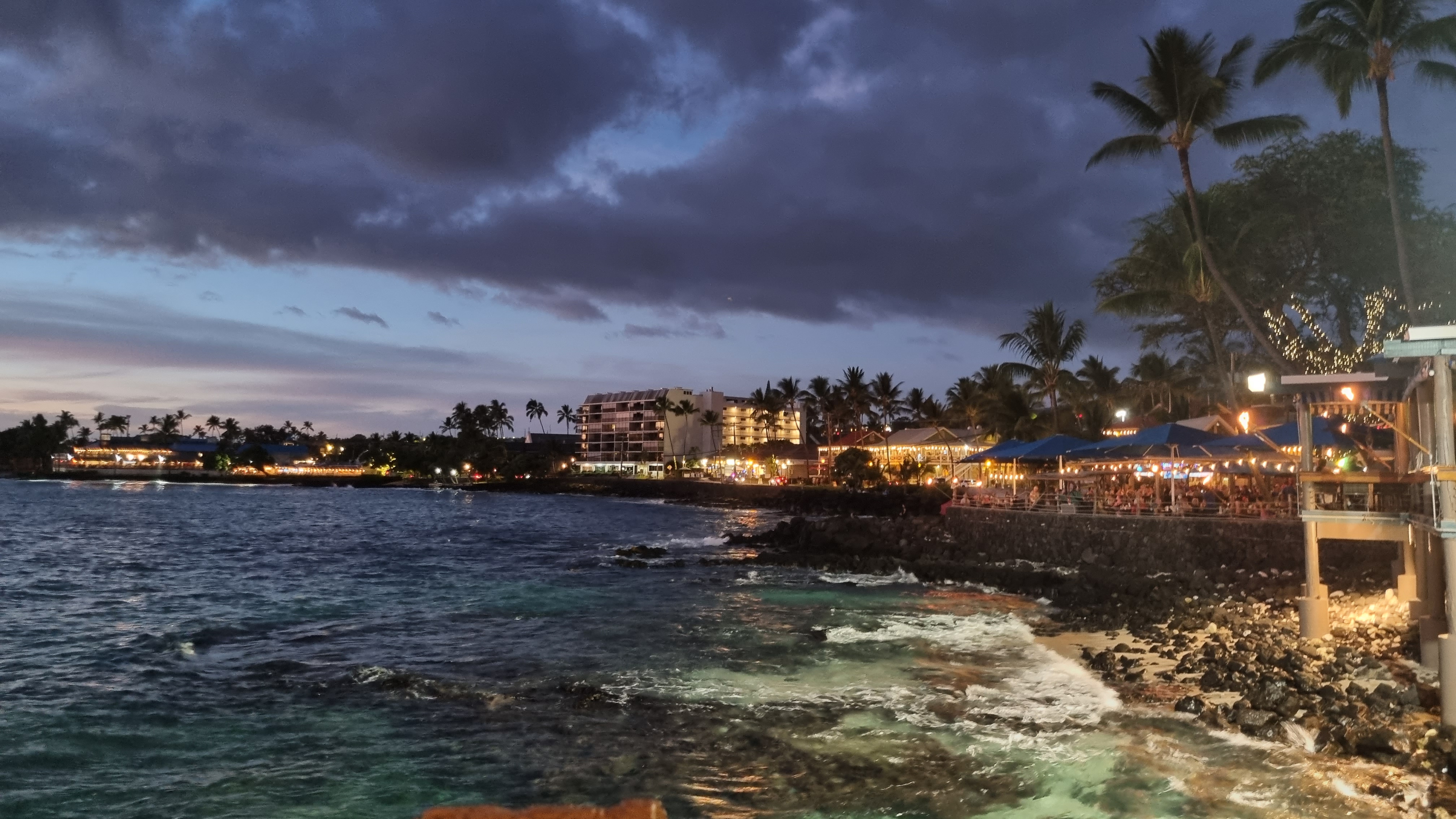 Der Tag begann mit einem Frühstück im Java Lava für Helga mit einem Kona Eclipse (Kona Coffee mit einem Kona Espresso). Damit kombiniert man den American Roast mit viel Coffein und einen Espresso Roast mit viel Geschmack. Anschließend sahen wir uns die fußläufigen Sehenswürdigkeiten in Kailua-Kona an. Neben den vielen Geschäften und Restaurants gibt es die Mokuaikaua Church, die erste Kirche Hawaiis. Gegenüber liegt der Hulihee Palace. Weiters ging es zum Tempel Ahuena Heiau.