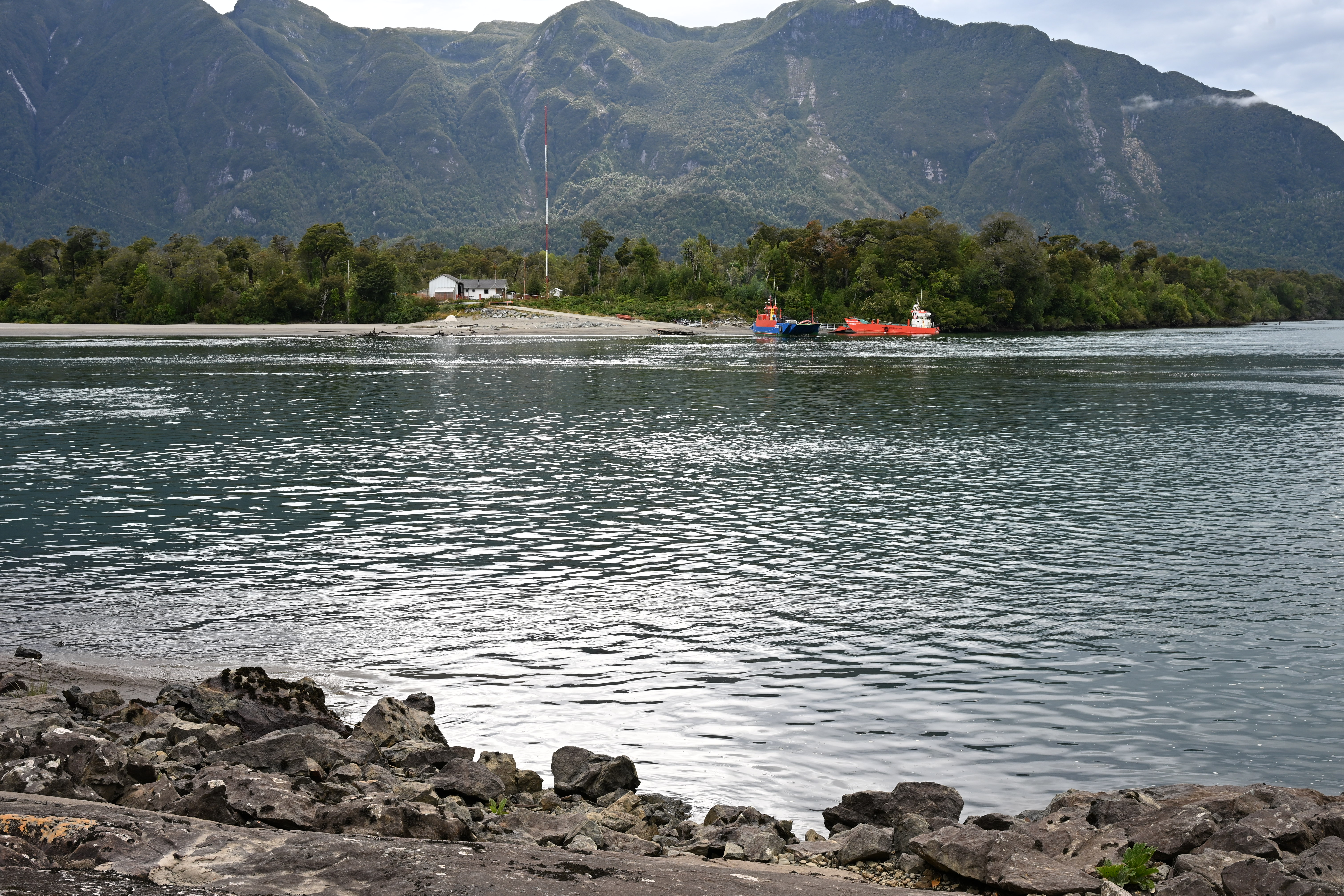Der Wetterbericht sagte für den Tag Regen an, wobei es Richtung Westen eher schlechter aussah. Wir fuhren dennoch nach Puerto Raul Marin Balmaceda, einem kleinen Hafen am Pazifik. Entlang der Schotterstraße sahen wir Schafe, Schweine, Ziegen und Rinder. Vor allem Rinder standen auch auf der Straße oder wechselten die Straßenseite. Ansonsten war auf der Straße wenig los.