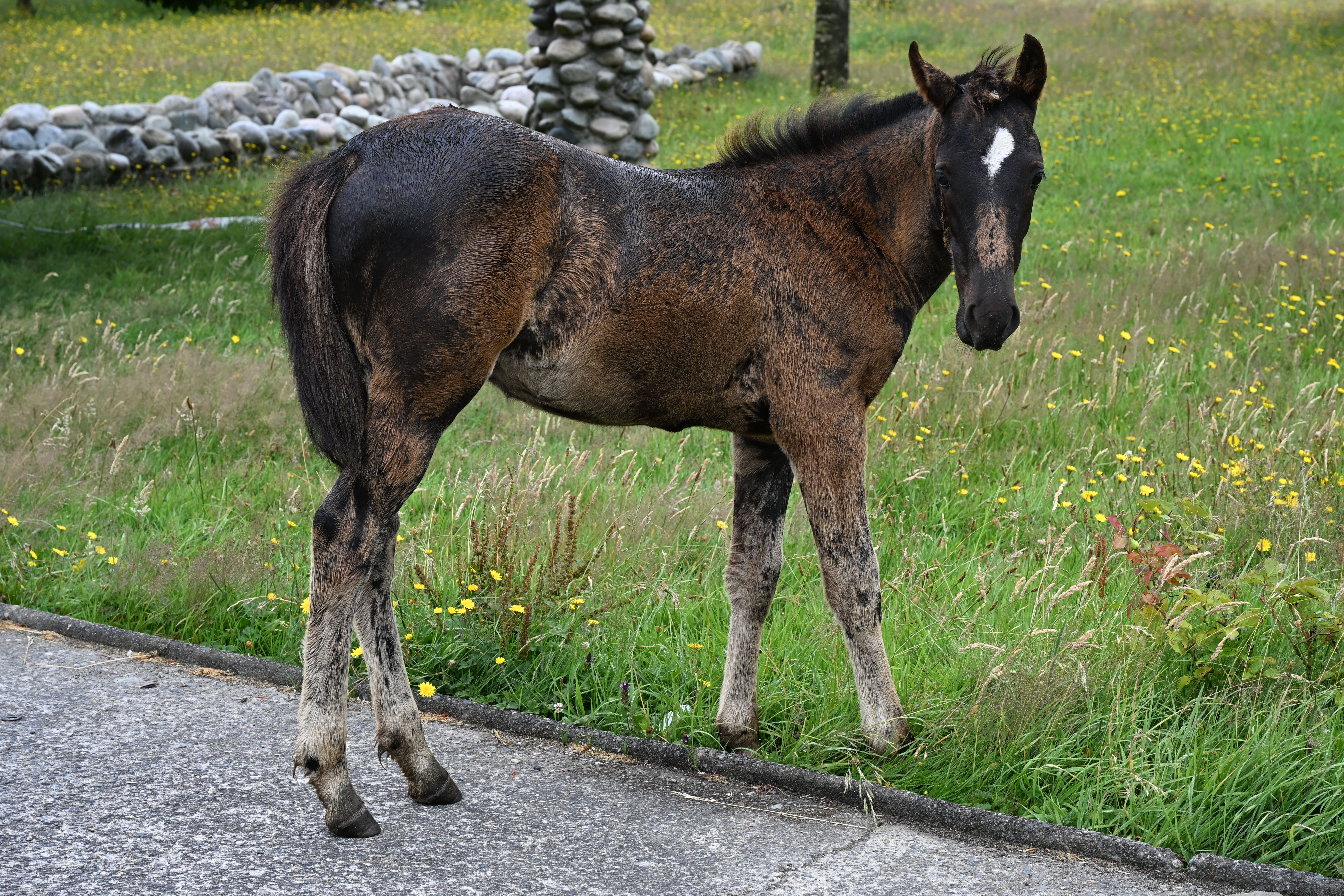 Inzwischen hatte es auch ordentlich zu regnen angefangen. In La Junta besuchten wir dann noch drei Supermärkte, weil wir glutenfreies Brot kaufen wollten. Wir wurden nicht fündig, allerdings gab es zumindest „Chocolate Chips sin Gluten“. Mitten im Ort sahen wir am Hauptplatz neben der chilenischen Araukarie (oder Andentanne) noch zwei Pferde, die Mutter angepflockt, das Fohlen konnte frei herumlaufen.