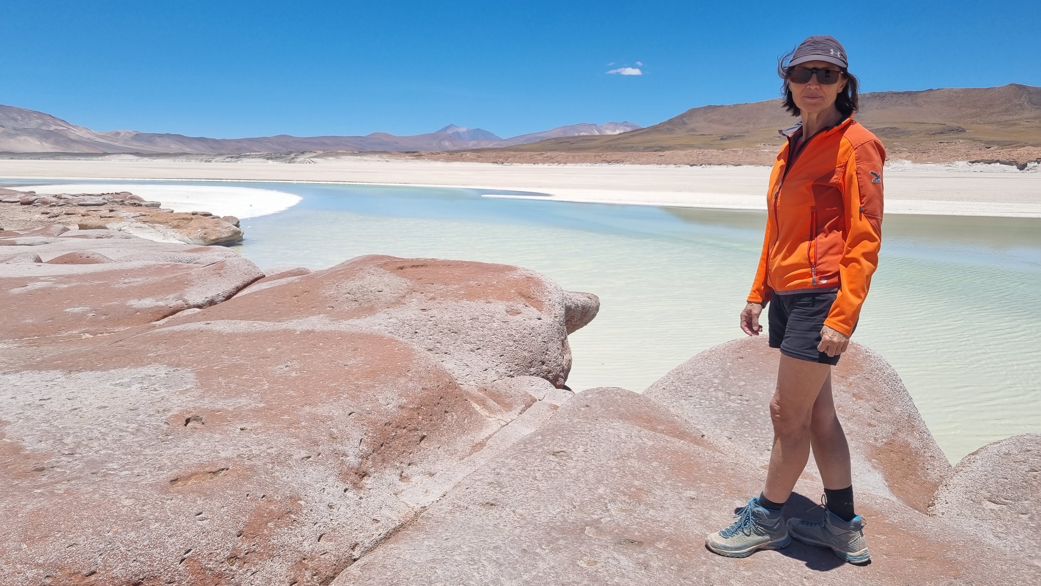 Der Start der kurzen Tour (3,5 km) beim Salar de Aguas Calientes liegt auf 4.150 m ü.M. Man besichtigt die roten Felsen und die heißen Wasser. Das Wandern in der Ebene war problemlos, Anstiege von vielleicht 1% merkt man als adulto mayor aber schon deutlich. Die Wassertemperatur konnten wir selbstverständlich nicht testen, da wir mindestens zweimal belehrt wurden, das Wasser ja nicht zu berühren und überall Parkwächter die Einhaltung der vielen Regeln (Wege nicht verlassen, nicht essen, nicht rauchen, etc.) überwachen.