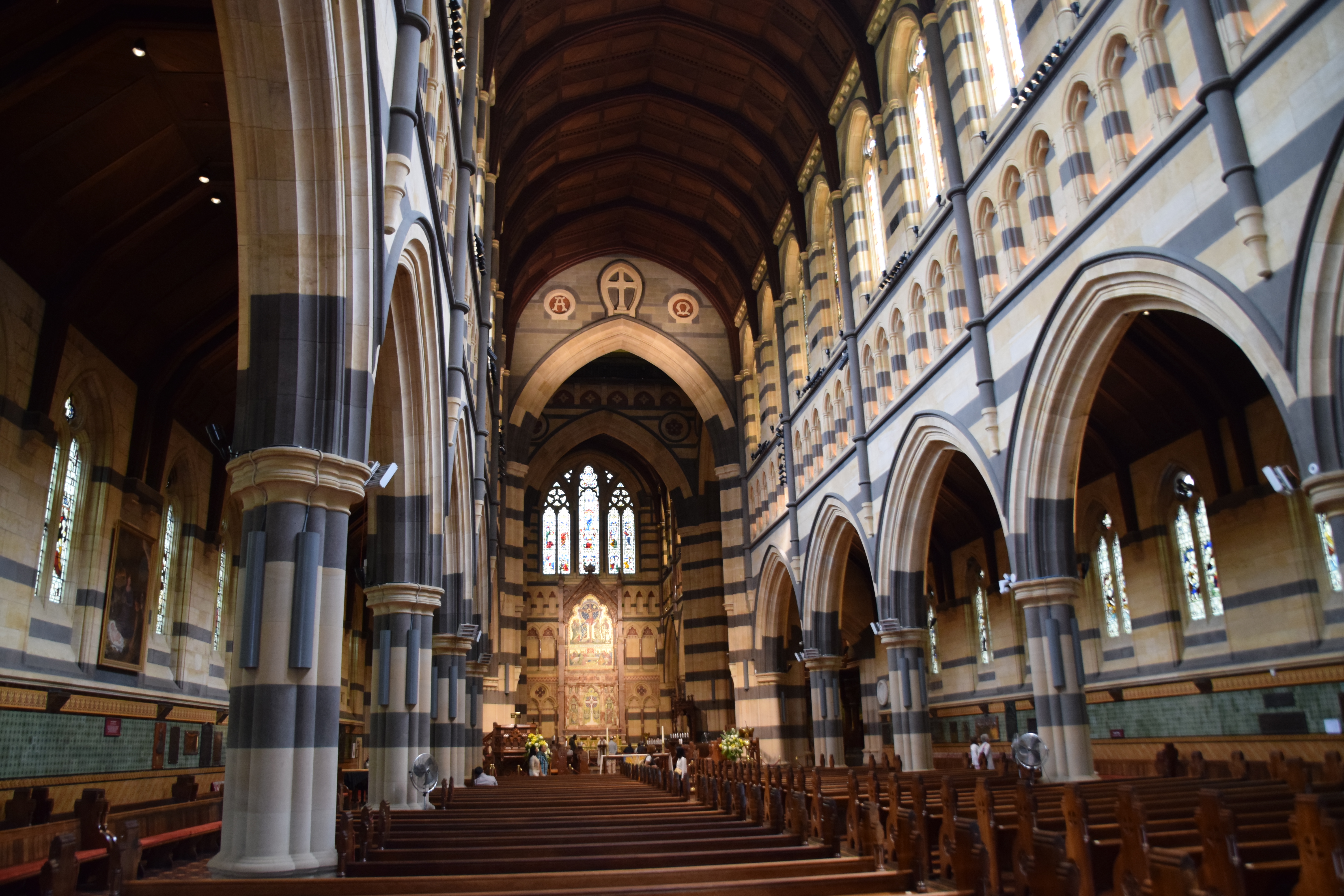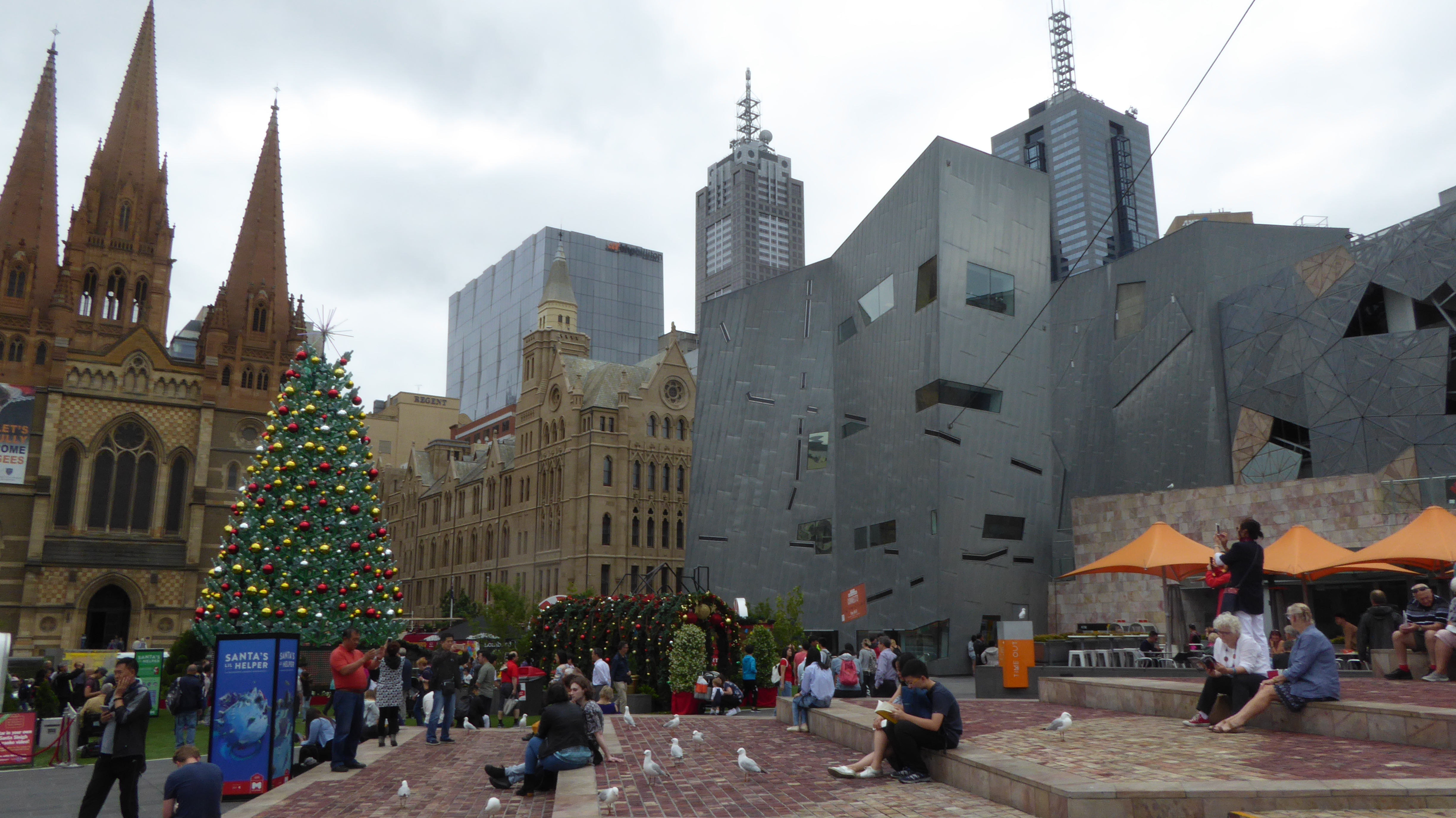 Danach nahmen wieder eine Straßenbahn und fuhren bis zur Flinders Station. Wir wählten den Weg durch die Flinders Station und machten am Federation Square im Time Out Cafè & Bar vor dem ACMI kurz Pause, um unseren obligatorischen Espresso einzunehmen. Das ACMI (Australian Centre for the Moving Images) ist ein spannendes Gebäude. Danach sahen wir uns die St. Paul’s Cathedral an, die der Kirche von Siena nachempfunden ist.  Wir kauften sogar eine Fotolizenz für 5 AUD um auch fotografieren zu dürfen.
