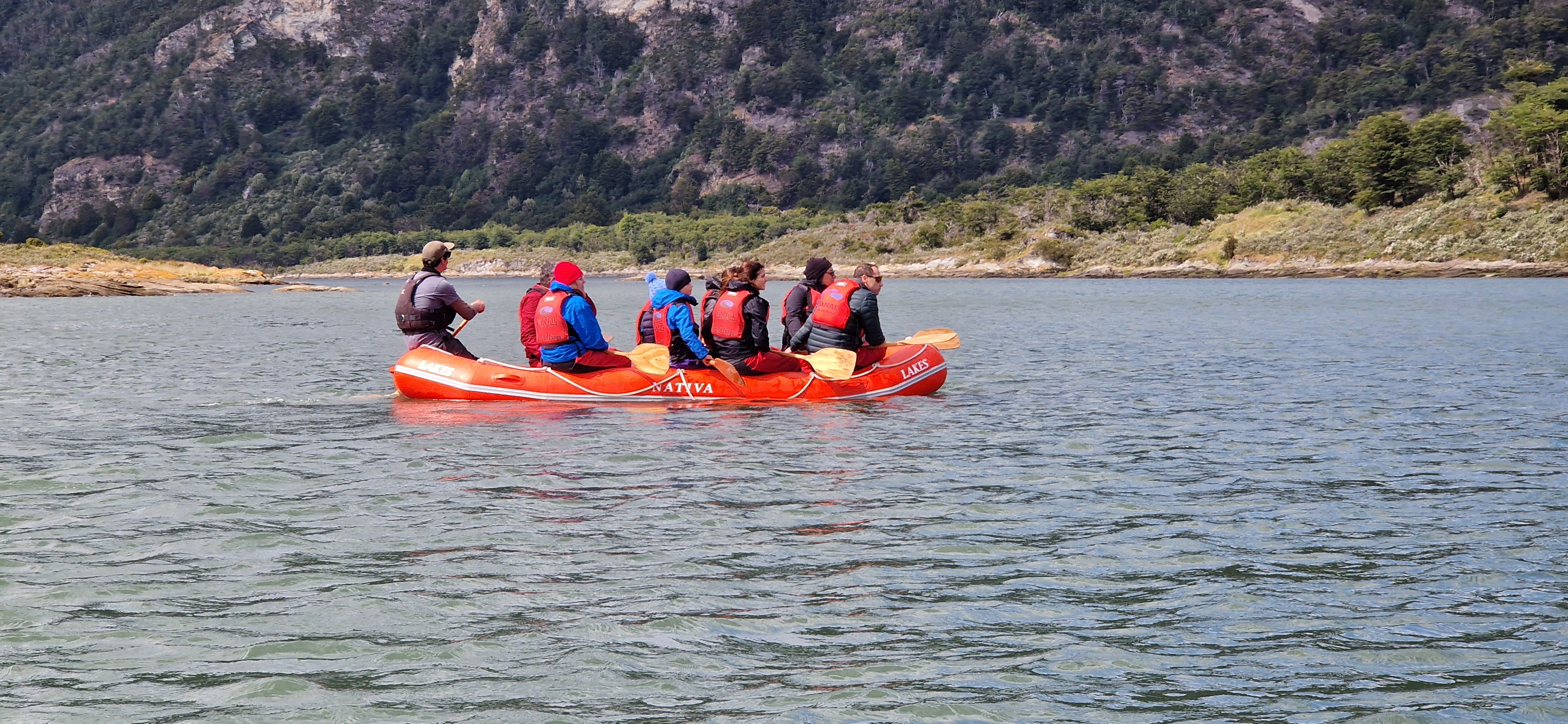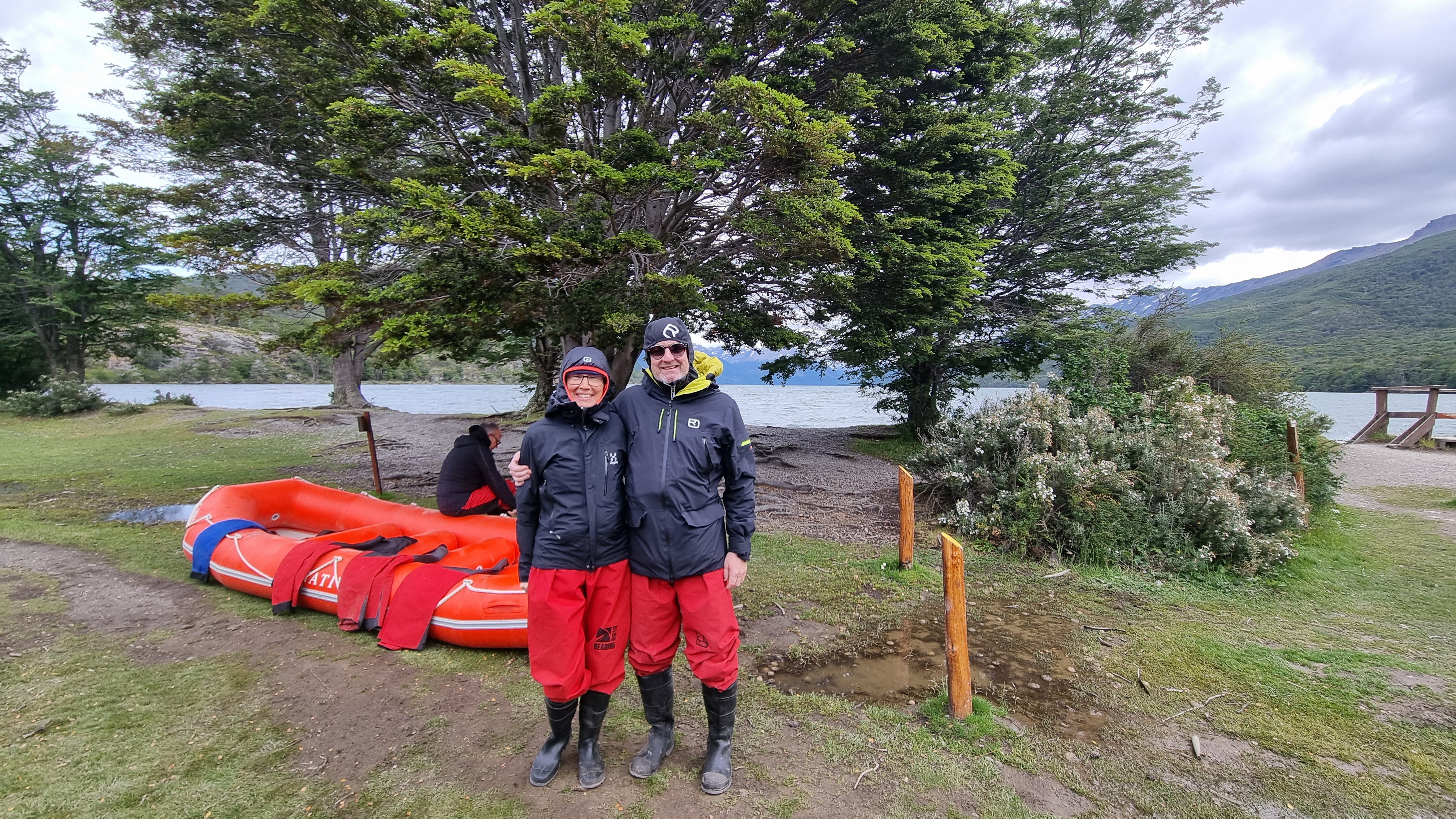 In unserem Boot befanden sich weitere 5 Personen, die aber Helga’s Meinung nach noch nie gerudert hatten. Auch unser Führer schien etwas unerfahren. Der Rafting-Guide befand sich im anderen Boot. Ein koordiniertes Paddeln war daher schwer möglich. Vom „Lago Roca“ ging es den Lapataia River abwärts, Paddeln war daher nicht wirklich notwendig. Nach einer Straßenquerung haben wir uns entschlossen, die erste Reihe zu übernehmen, um zumindest den Takt vorzugeben. Helga wurde an ihre Arbeit erinnert, wenn Teammitglieder nicht im Interesse aller arbeiten. Quatschen und sich nicht kümmern, was ansteht, geht für Helga auch im Urlaub gar nicht. Am Ende haben wir es dann doch bis zur Lapataia Bucht geschafft.