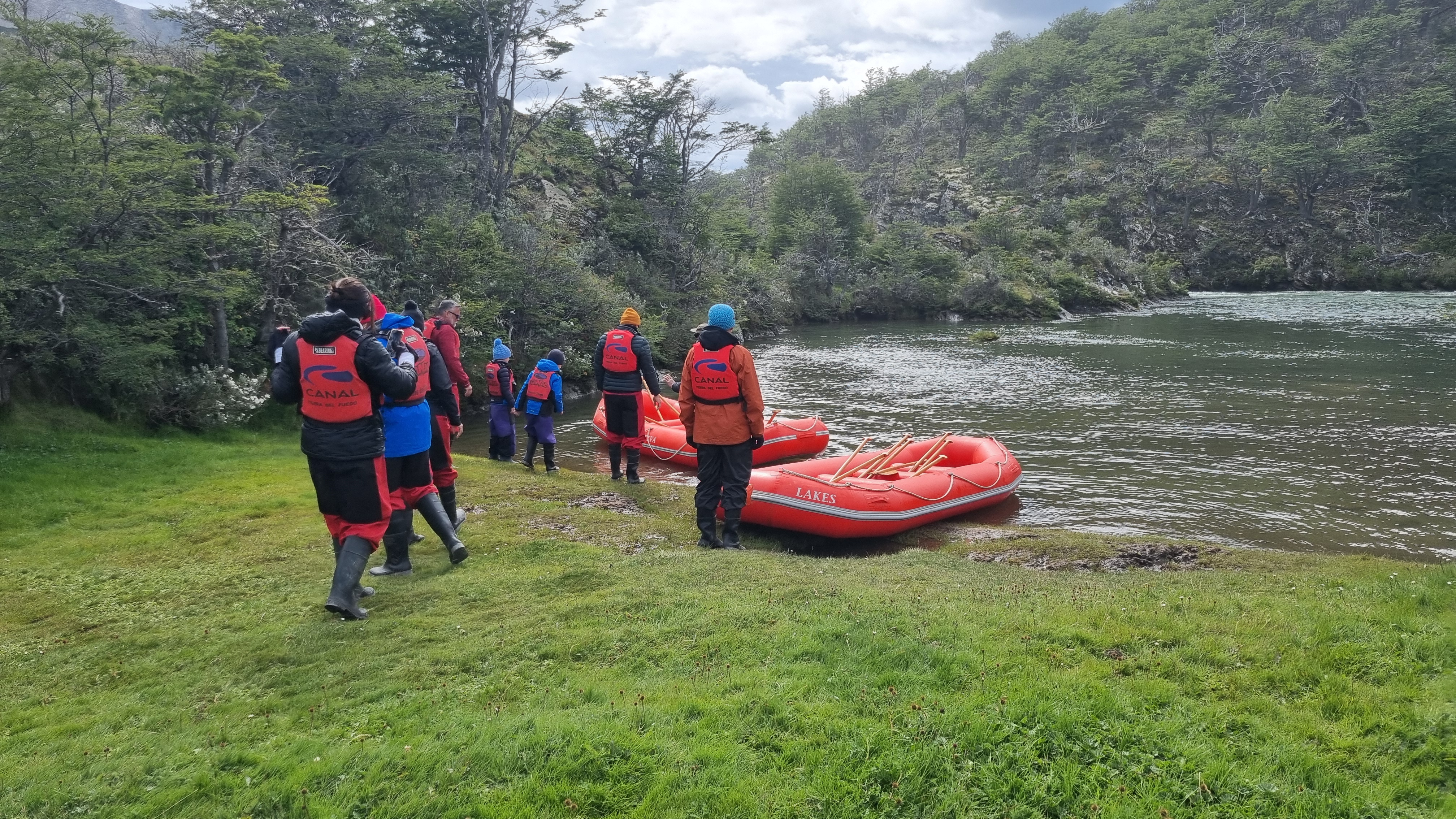 Wir wurden um 8:35 pünktlich zu unserer Ganztagestour in den Nationalpark Tierra del Fuego abgeholt. Nach einem etwas langwierigen Bezahlen des Eintritts (40.000 pro Person) und einer Toilettenpause beim Visitor Center wurden wir zum Start der Bootstour gebracht und mit Regenhosen, Gummistiefeln und Schwimmwesten ausgestattet.