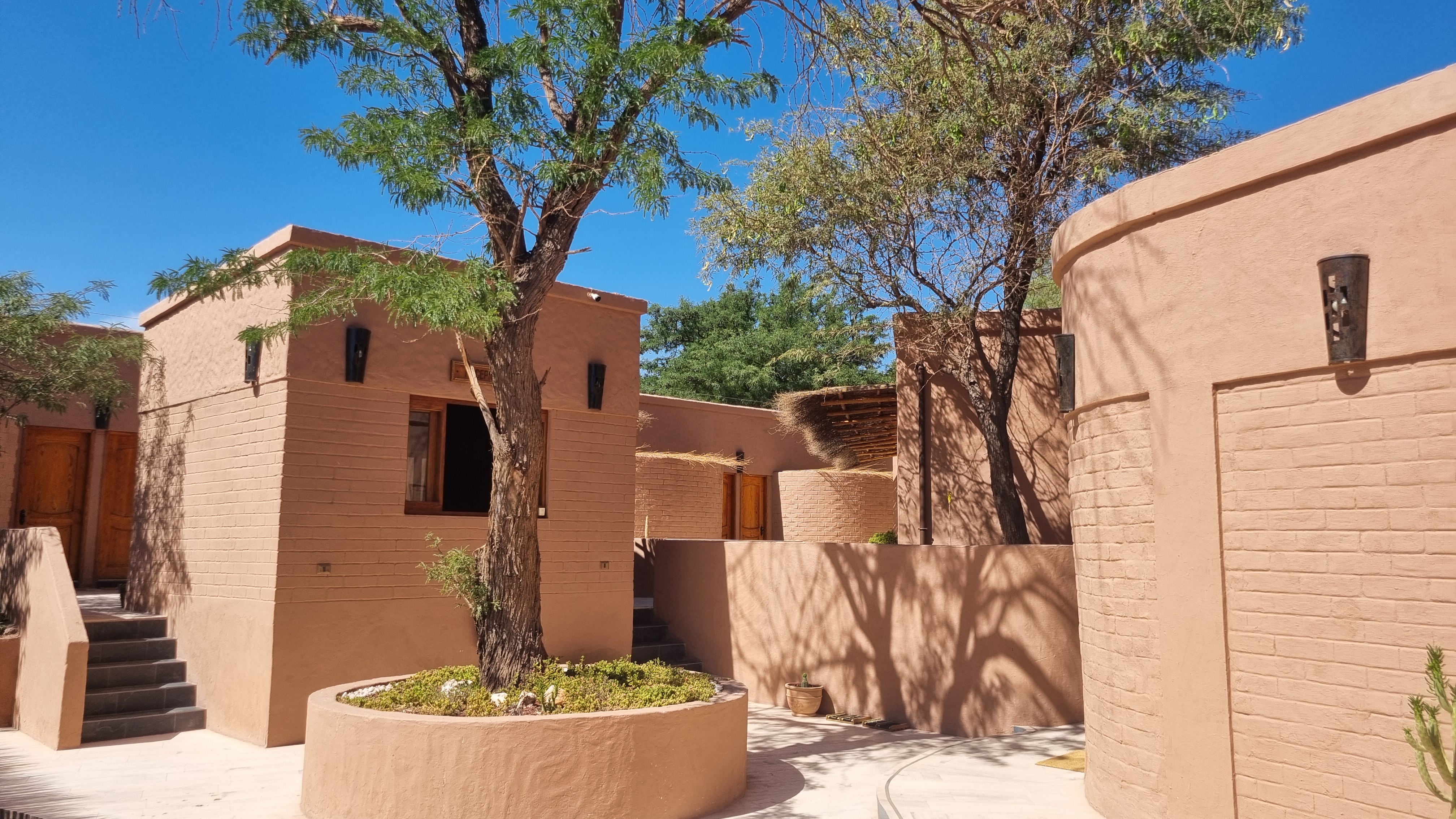 Den Nachmittag verbrachten wir im Ort und wir nahmen einen späten Lunch in der Caracoles, der Hauptstraße für Restaurants und Geschäfte. Beim Heimweg blies der Wind mit Böen bis zu 40 km/h, was bei den durchwegs innerörtlichen Sandstraßen ein wenig ungemütlich war. Die städtebauliche Architektur von San Pedro de Atacama ist zumindest für uns neu. Die Straßen werden auf beiden Seiten von 2 bis 2,5 m hohen Lehmwänden begrenzt. Es gibt keine Vorgärten oder Bäume. Hinter den Lehmwänden finden sich die Gebäude. Unser Hotel, wie auch viele andere, besteht aus einer Vielzahl von niedrigen Einzelgebäuden (Rezeption, Frühstücksraum, Küche, Zimmertrakt). Die Lounge ist offen und überdacht.