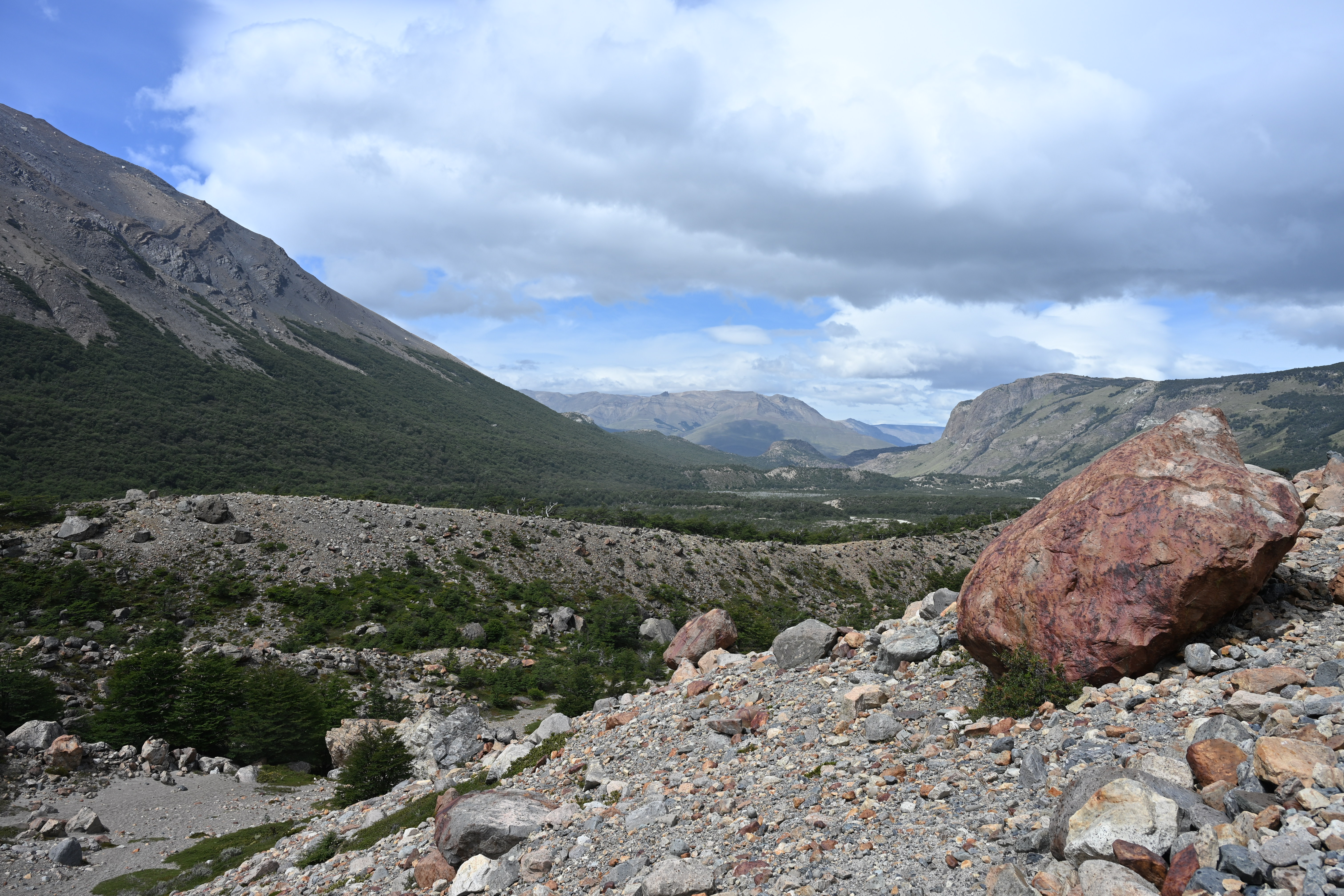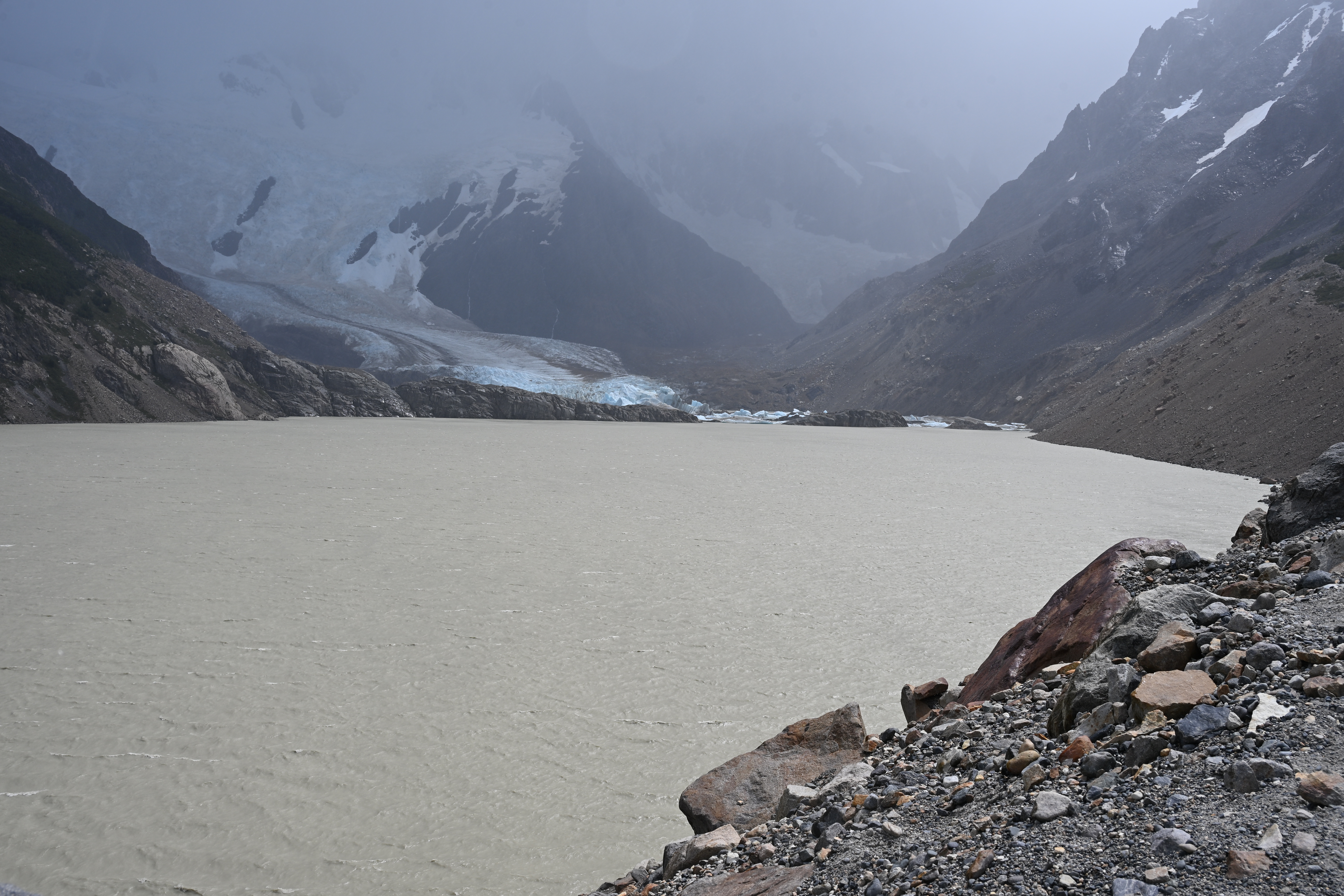 Der Weg ist sehr angenehm. Man muss nur 2 wenig hohe Endmuränen überwinden. Der Rest verläuft eben, wobei die Vegetation zwischen niedrigem Gestrüpp (in der Ebene) und hohen Bäumen (in der Nähe der Endmuränen) wechselt. Die Laguna selbst ist wieder spektakulär. Der Cerro Torre hat leider das aufkommende schlechte Wetter aufgefangen und war daher durch Wolken verdeckt.