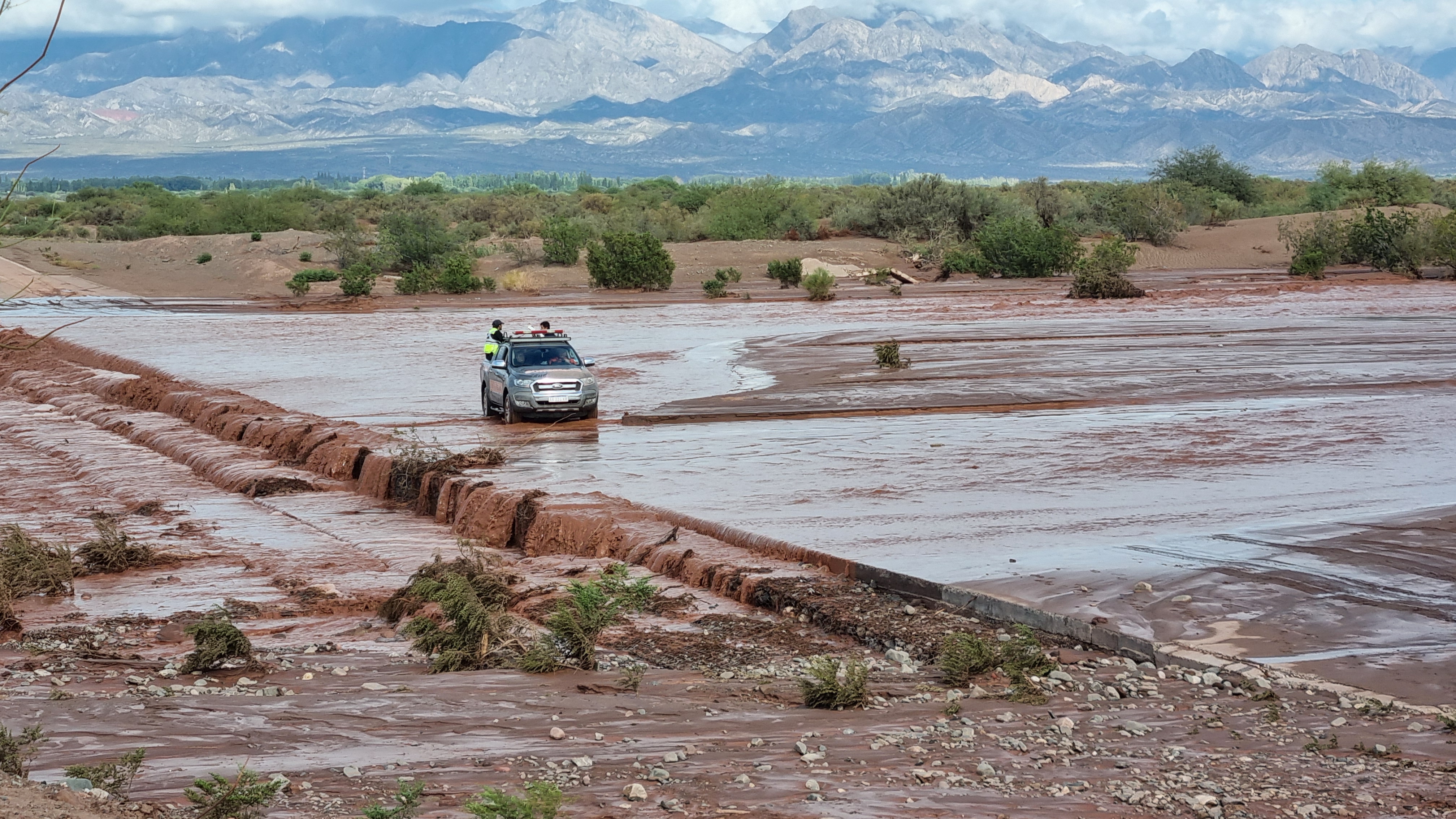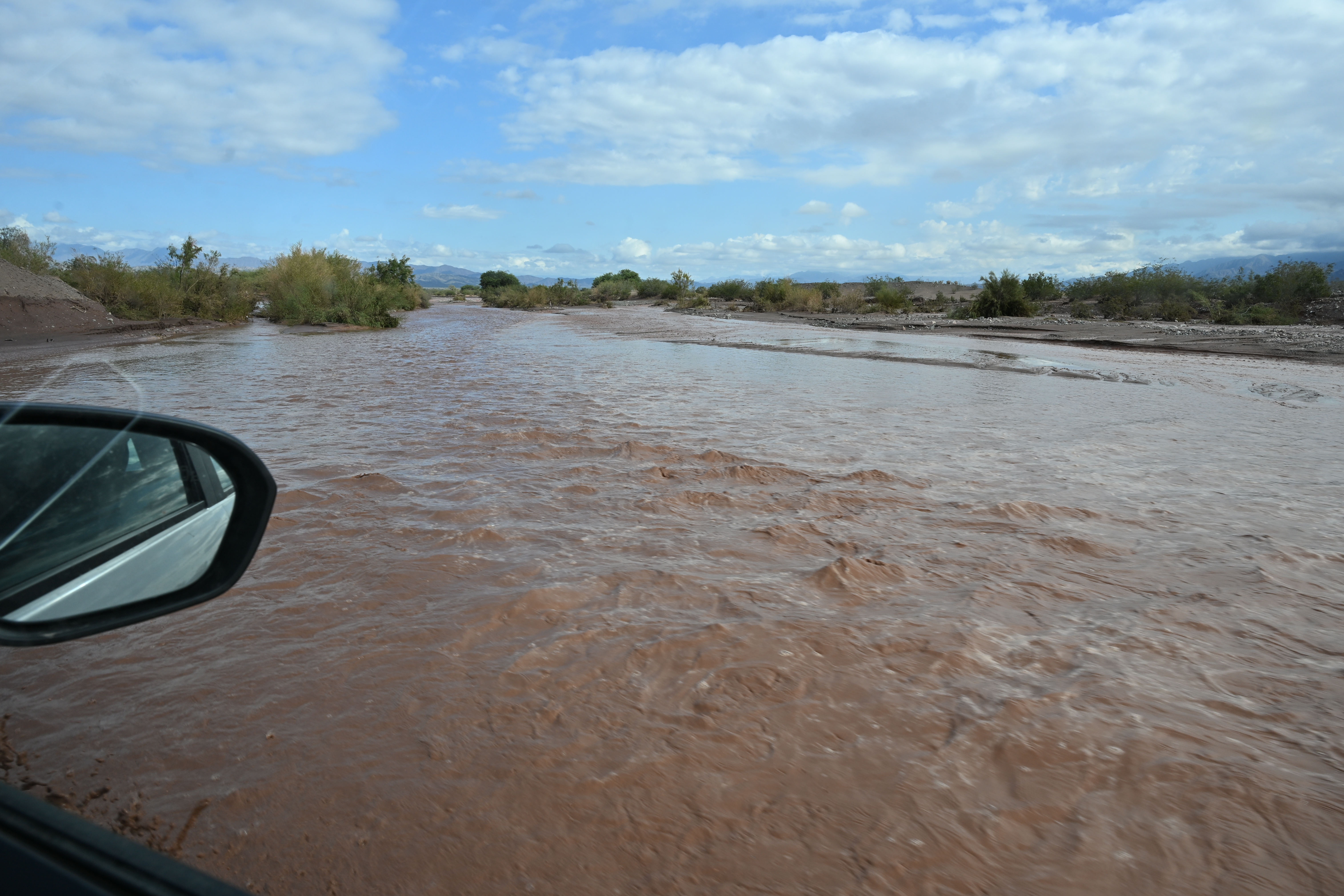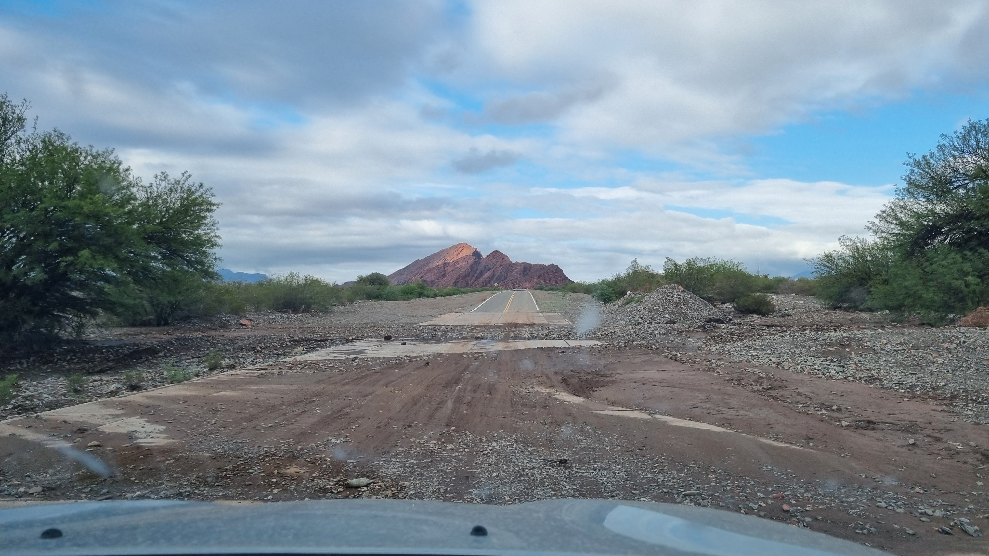Auch heute Nacht hatte es wieder ordentlich gewittert. Vom Regen hatten wir in unserem Quartier nichts mitbekommen. Mir bemerkten auf der Fahrt aber sehr bald, dass es in den umliegenden Bergen doch stark geregnet haben musste. Die Absenkungen in der Straße (eigentlich Furten) waren auf der Ruta 40 mit Sand und Geröll gefüllt. Da es aber relativ eben war, konnte man recht zügig darüber hinweg fahren. Einige Male floss auch noch Wasser quer über die Straße.