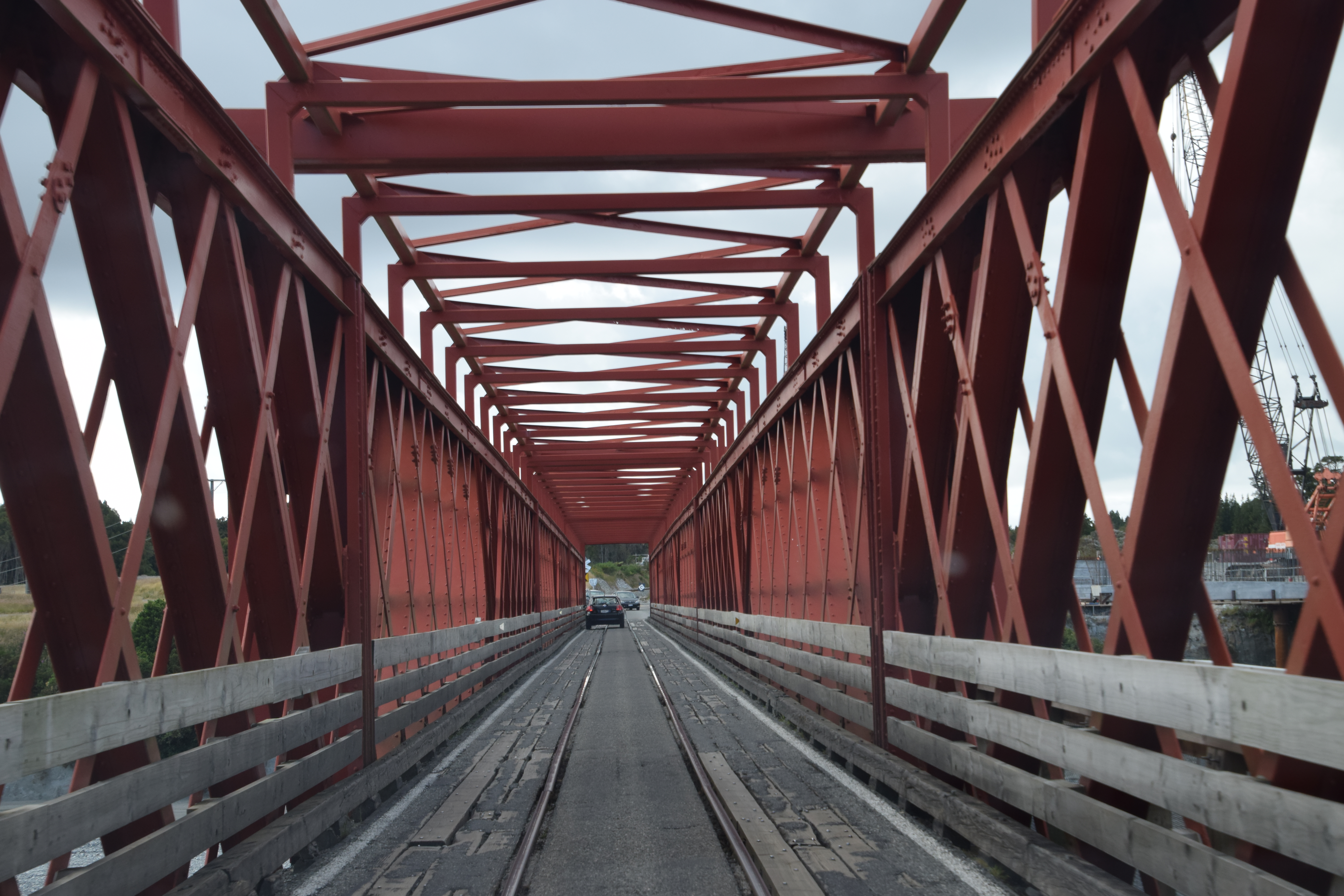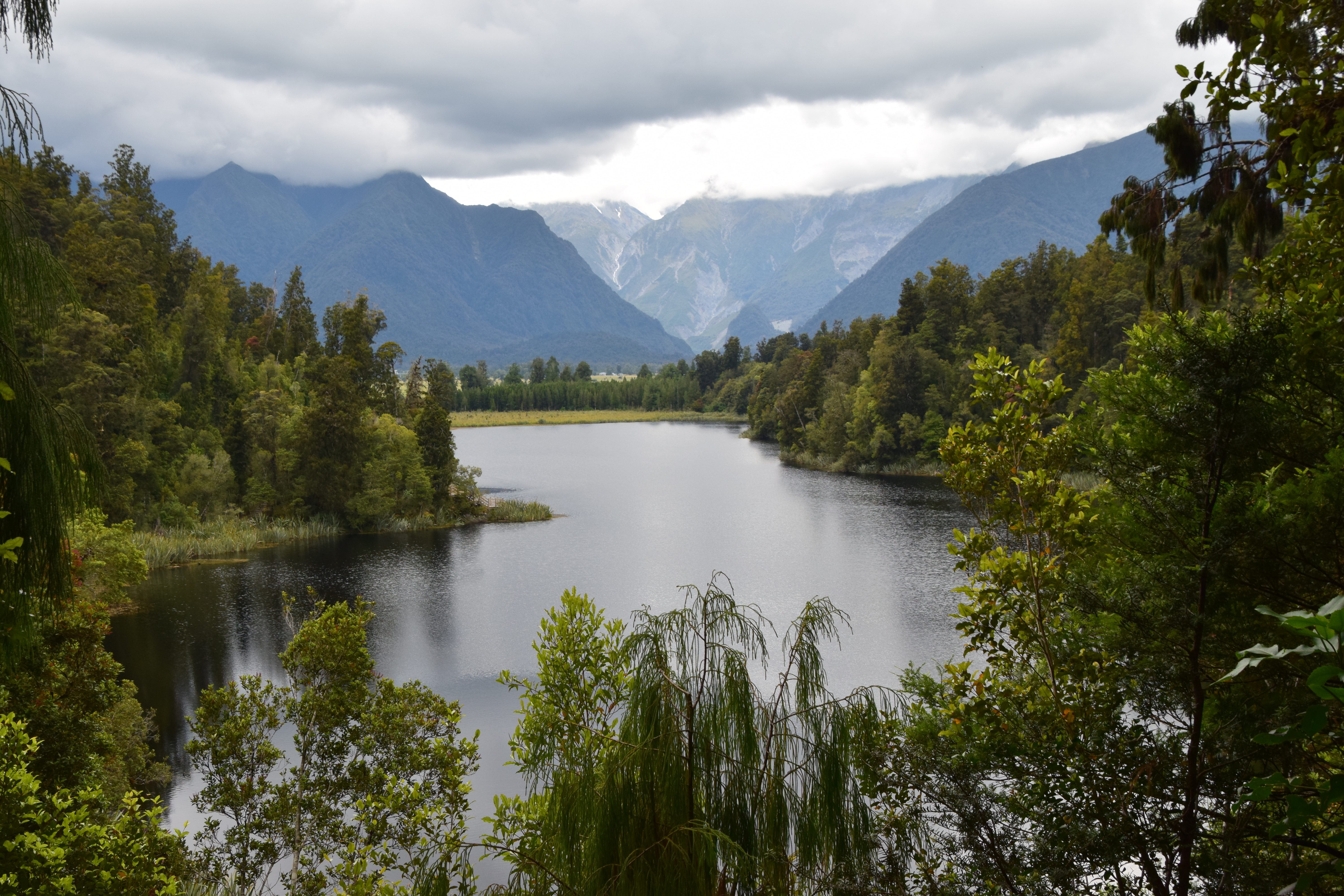 Die Fahrt ging zuerst recht gerade an der Küste entlang, dann durch Wälder – ein einziges Grün. Die Berge waren wolkenverhangen, die Wettervorhersage stand auf 60% Regenwahrscheinlichkeit. Nachdem von den Bergen laufend Flüsse in Richtung Meer gehen, gibt es viele Brücken – die meisten davon sind „One Lane Bridge“, manche auch mit Ausweichen auf der Brücke, wenn sie sehr lang sind (wie ganz am Schluss beim Haast-River sogar mit zwei Ausweichen).