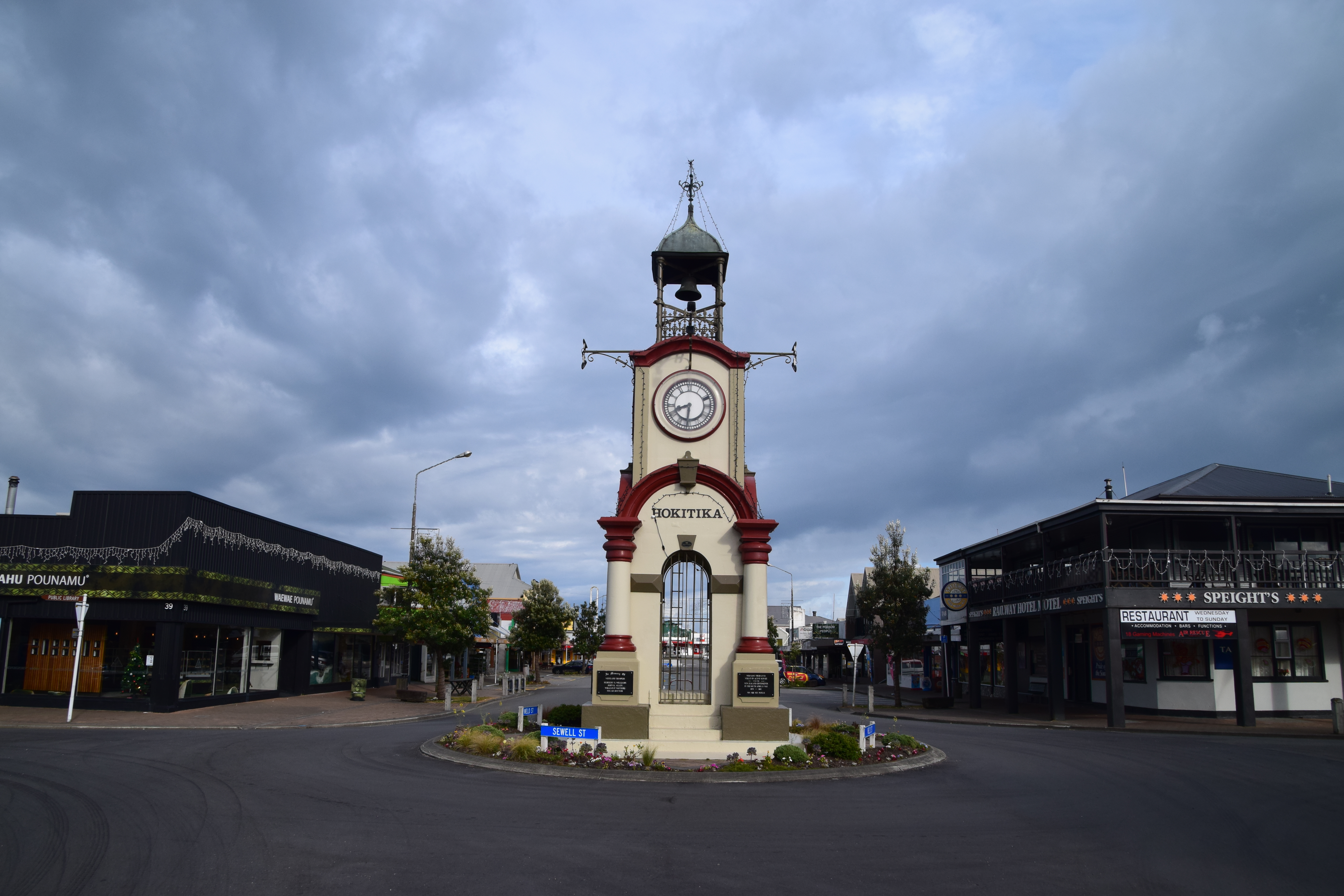 Bereits um 8:30 waren wir in Hokitika. Der Ort ist vor allem für seine Jadeproduktion berühmt. Wir bekamen auch die Hokitika Town Clock zu hören, die im zentralen Kreisverkehr des Ortes steht. Zumindest ansehen wollte Helga sich die diversen Geschäfte, auch wenn die grünen Steine nicht das Ihre sind. Grundsätzlich wirkt alles sehr kommerziell; ein paar schöne, aber dann teure Stücke waren schon dabei.
