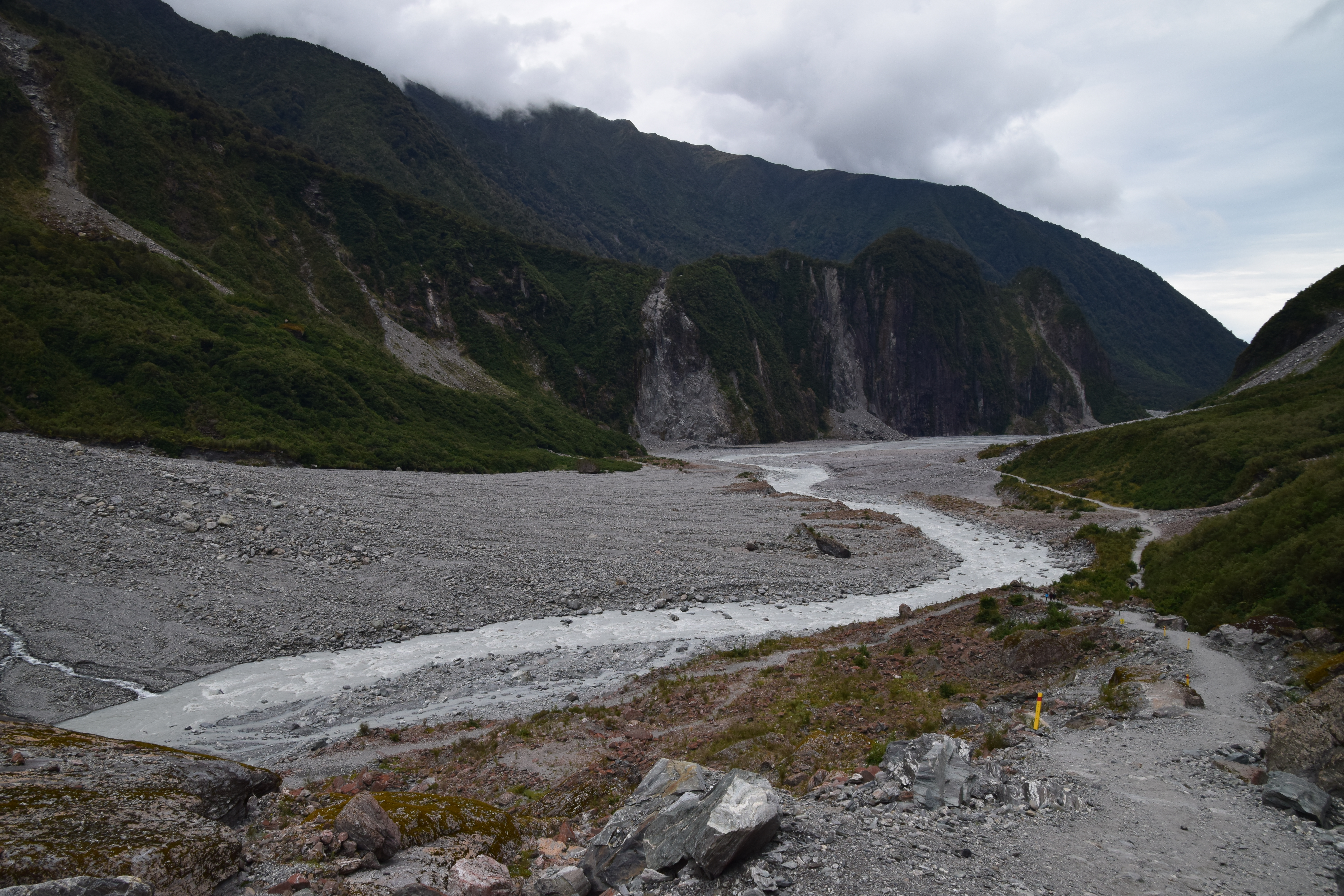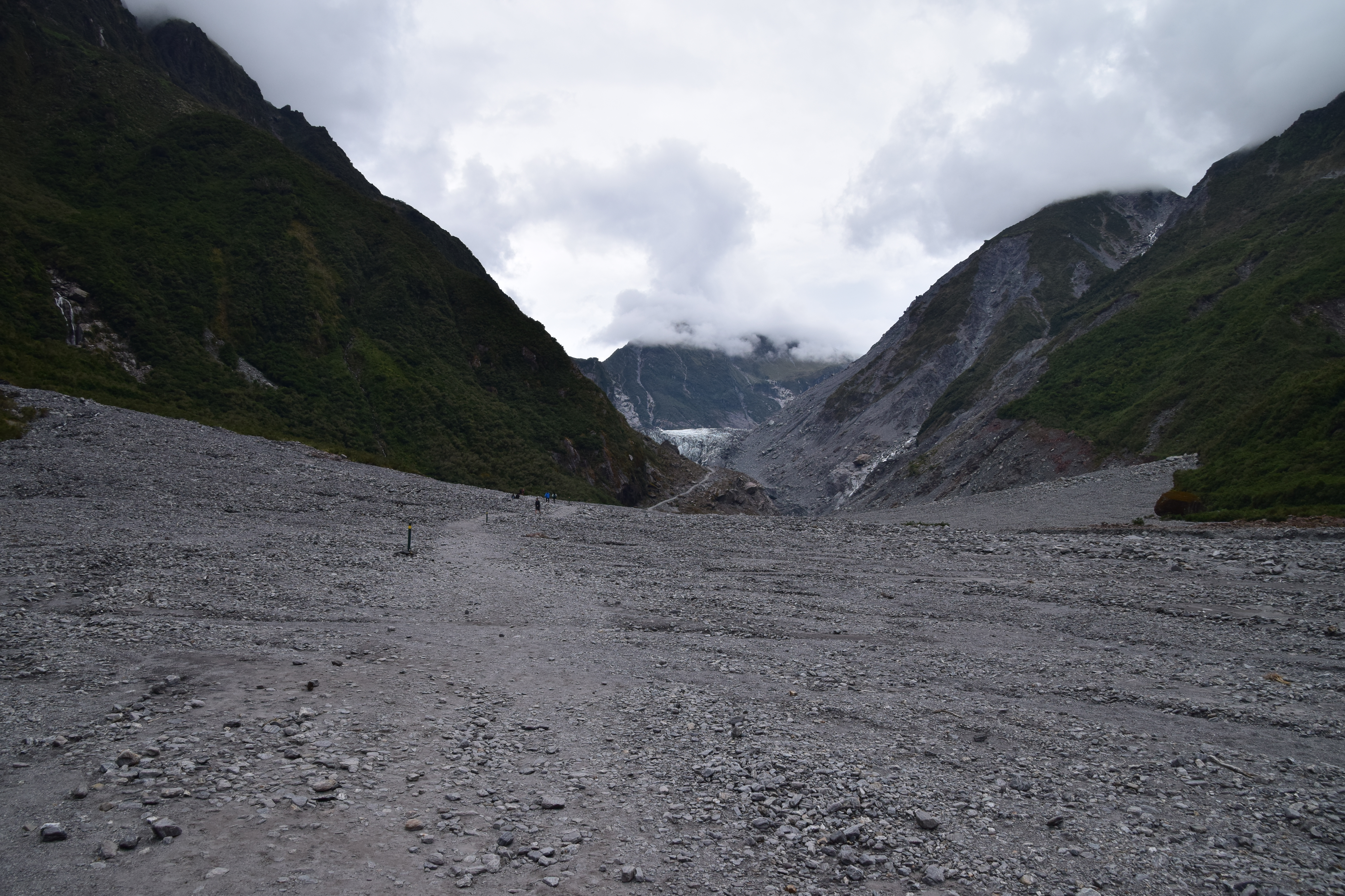 Am Lake Mapourika hielten wir nur für einen Fotostopp. Der nächste Halt war schon am Franz-Josef-Gletscher. Man fährt von der H6 rund 4km bis zum Parkplatz. Dort gibt es dann verschiedenste Walks. Wir nahmen den Kürzesten, den „Sentinel Rock Walk“ (20 Minuten hin und zurück). Der Blick auf den Gletscher sollte phantastisch sein. Naja. Alternativ kann man eine 1,5-stündige Wanderung zum Glacier Terminal Face machen. Da wir im Internet gesehen haben, dass man beim Fox Gletscher näher an das Terminal Face kommen, haben wir uns das für später aufgehoben.
